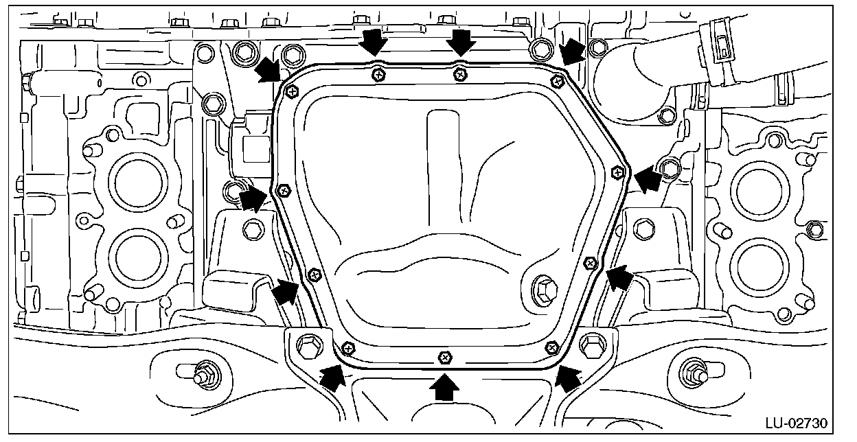 1) Apply liquid gasket to the mating surface of the oil pan upper, and install the oil pan.