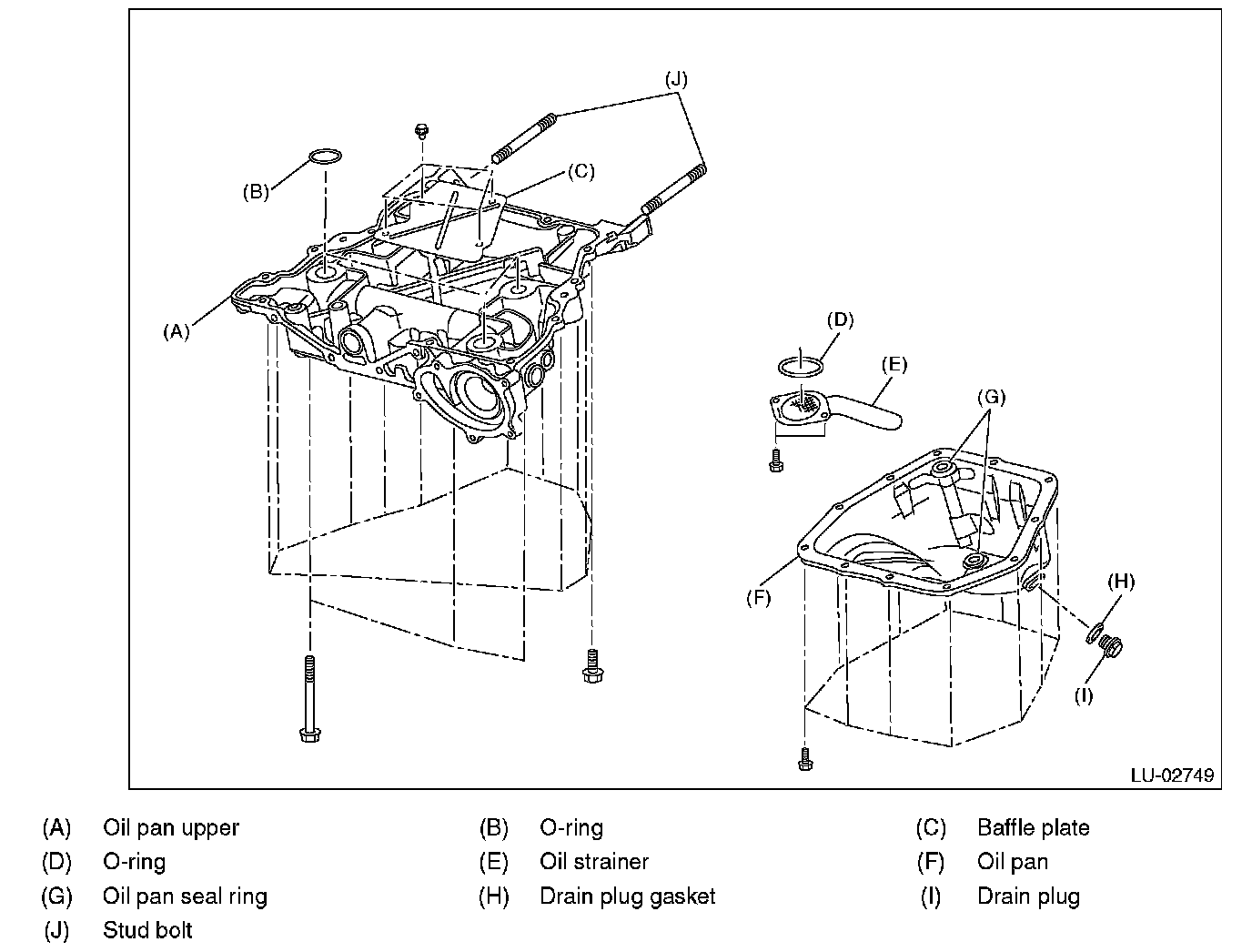 Check that the oil pan, oil pan upper, oil strainer and baffle plate do not have deformation, cracks or damage.