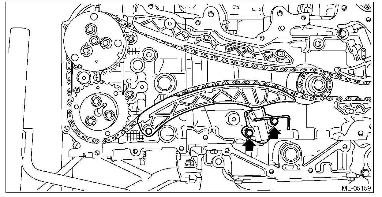 4) Remove the chain tensioner LH, and remove the chain tensioner lever LH (A).