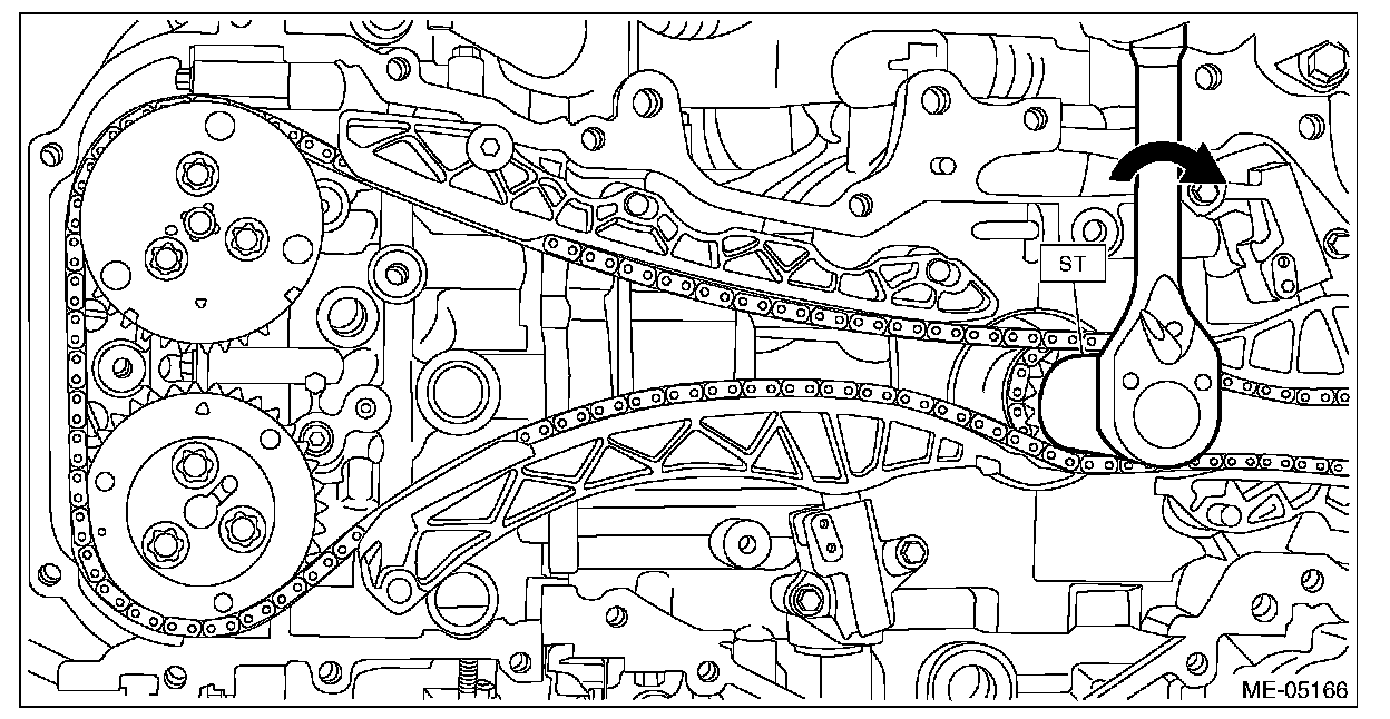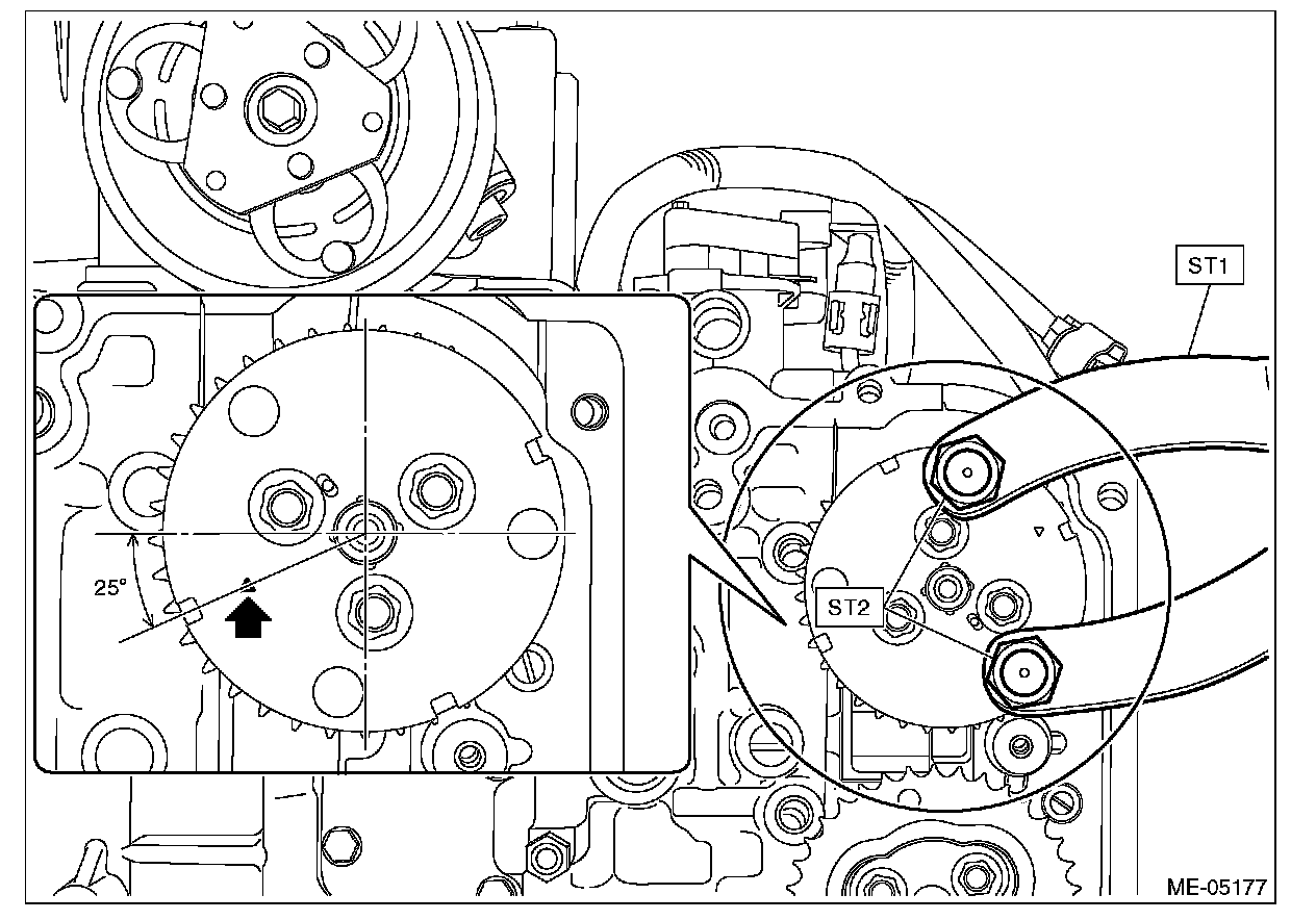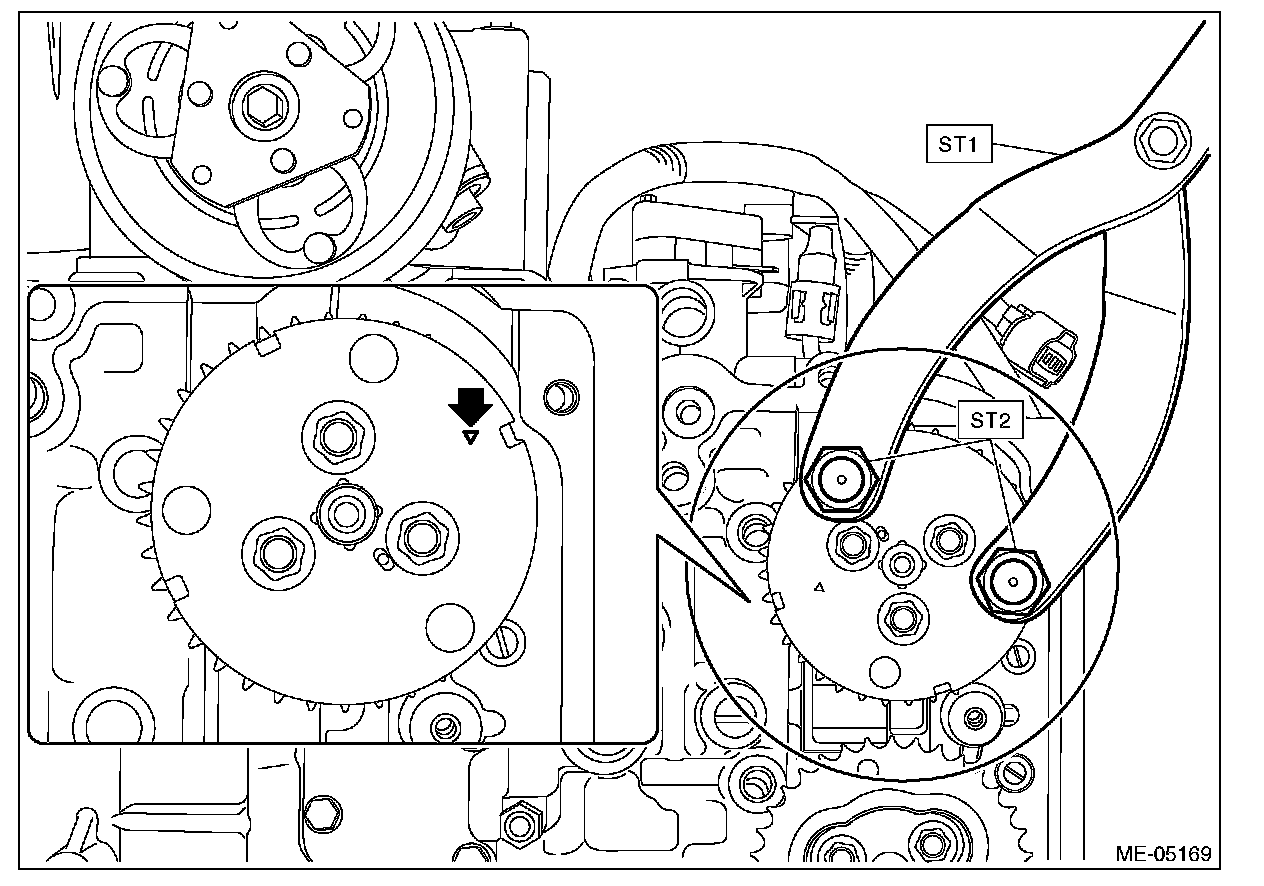 8) Using ST and by turning the intake cam sprocket LH approximately 180°, align the alignment marks of intake cam sprocket LH to the positions (zero-lift position) as shown in the figure.