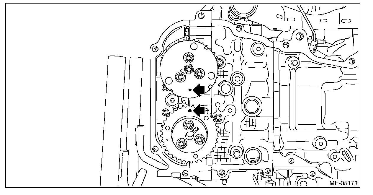 4) Align the alignment marks of intake cam sprocket RH and exhaust cam sprocket RH to the positions as shown in the figure.
