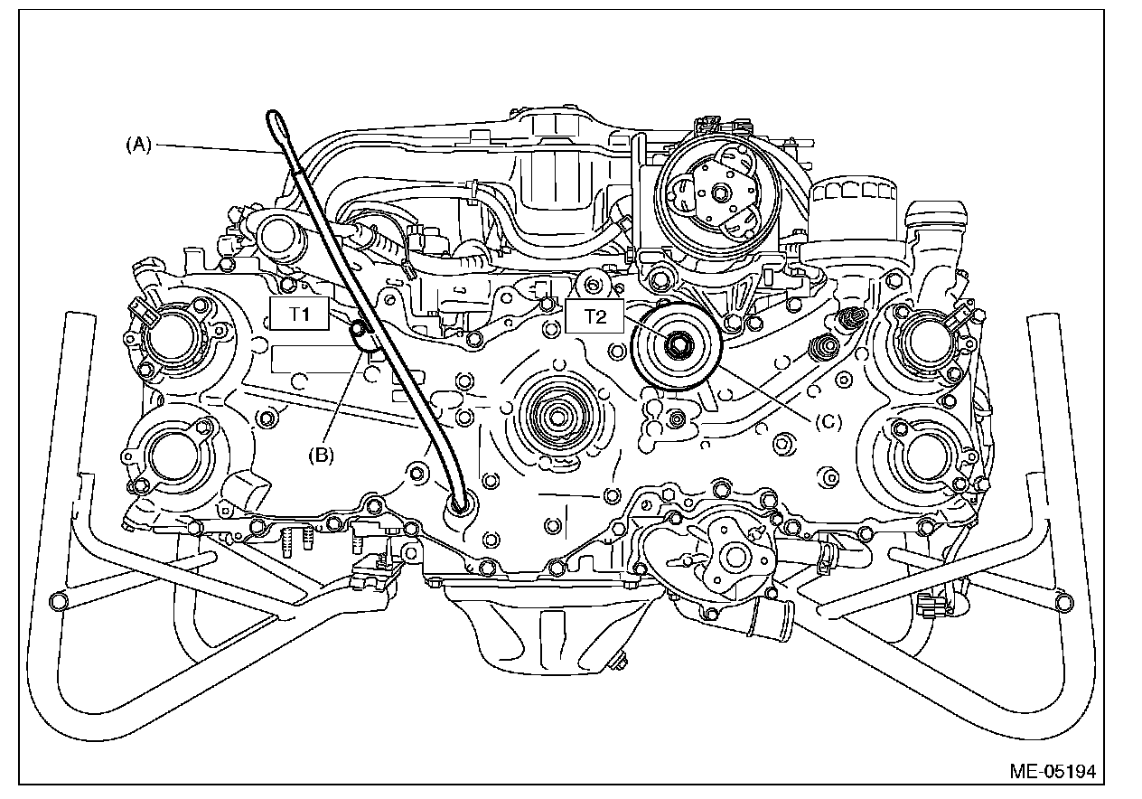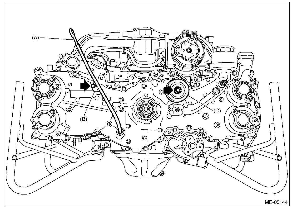 5) Install the idler pulley (C) and oil level gauge guide (B), and insert the oil level gauge (A).