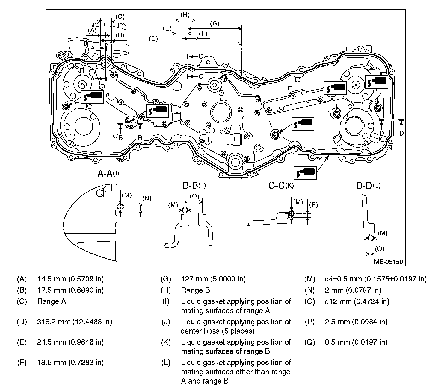 3) Apply liquid gasket to the chain cover mating surface and center boss (5 places) as shown in the figure.