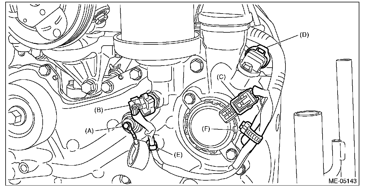 8) Disconnect the terminal (A) from the oil pressure switch, and connector (B) from the engine oil temperature sensor, and connector (C) from the oil control solenoid LH, and connector (D) from the camshaft position sensor LH, and remove the clip (E) and clip (F) which secure the engine harness.