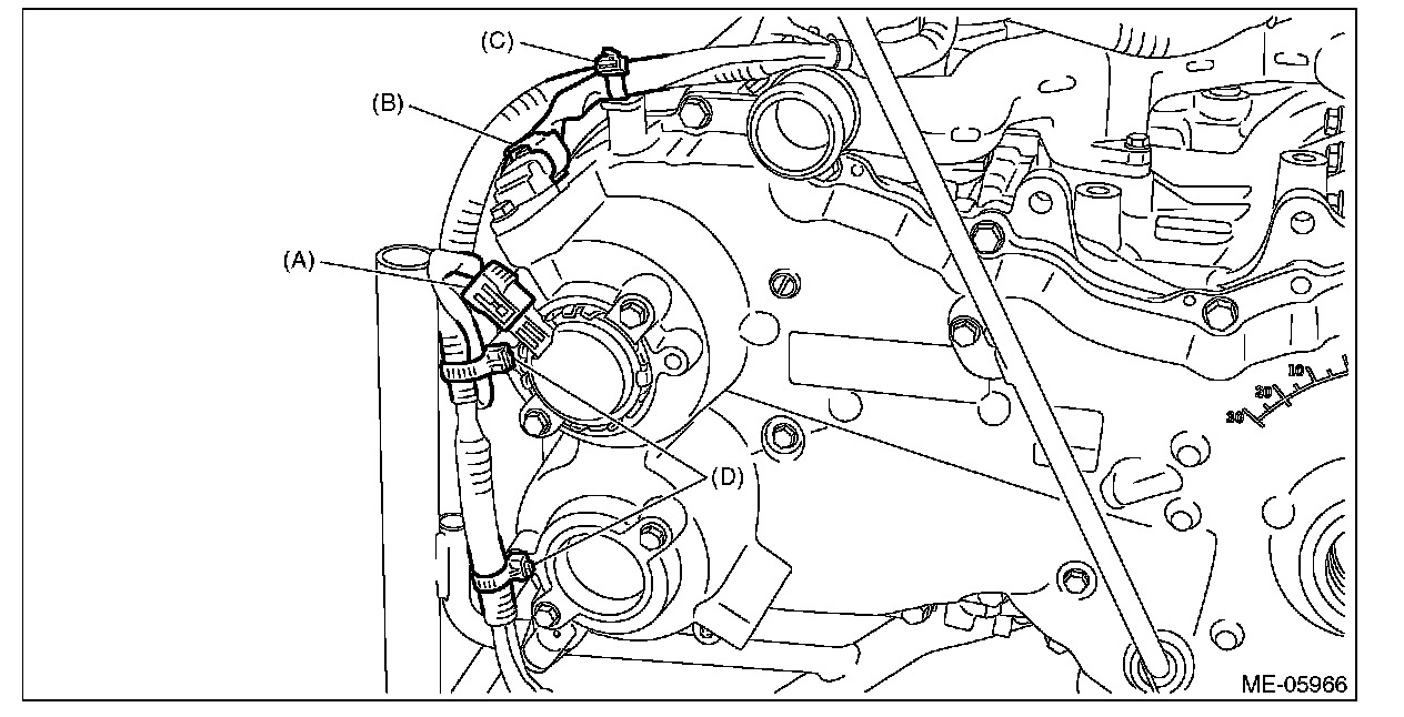 6) Disconnect the connector (A) from the oil control solenoid RH, and the connector (B) from the camshaft position sensor RH, and remove the clip (C) and clip (D) which secure the engine harness.
