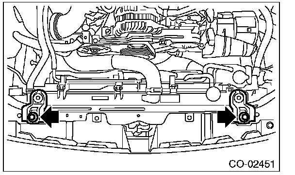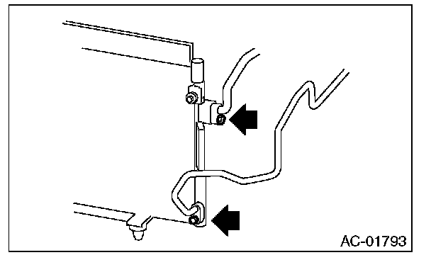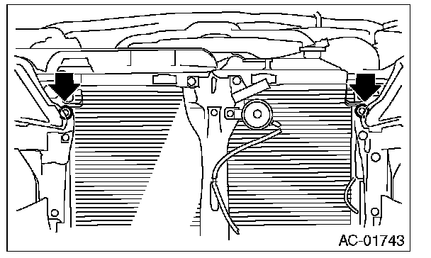 7. Remove the bolts, and lift the condenser to pull it out through space between the radiator and the radiator panel.