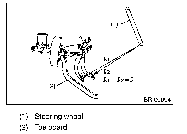 Run the engine at idle after warming up the engine, and depress the brake pedal with a force of 500 N (51 kgf, 112 lbf). Measure the distance between the brake pedal and steering wheel. Release the pedal, and measure the distance between pedal and steering wheel again.