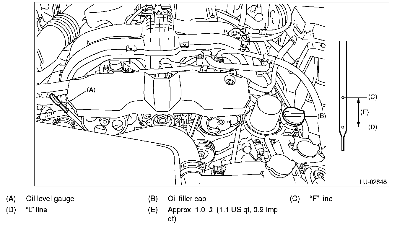 6) Select engine oil of adequate quality and viscosity and fill it through the oil filler duct to the "F" line on the oil level gauge. Make sure that the vehicle is parked on a level surface when checking oil level.