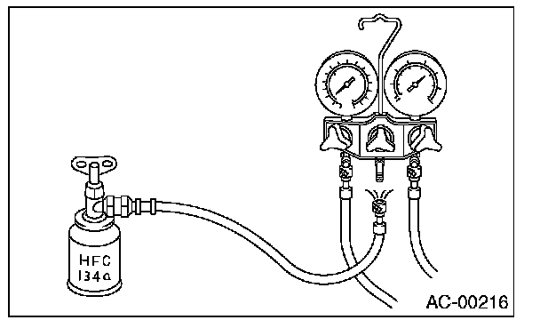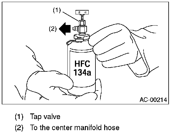 18. If the HFC-134a supply container becomes empty, close all valves, and close the can tap valve to replace the empty container. After replacing with a new HFC-134a supply container, perform air purge, and resume the filling operation.
