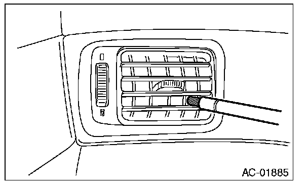 6. Turn the ignition key to the ON position, and run the blower at high speed for approx. 1 minute. Stop the blower and check the ventilation grille on the instrument panel. While moving the tester closer to the grille, run the blower for 1 or 2 seconds, then stop it. Check the grille at that position for at least 10 seconds.