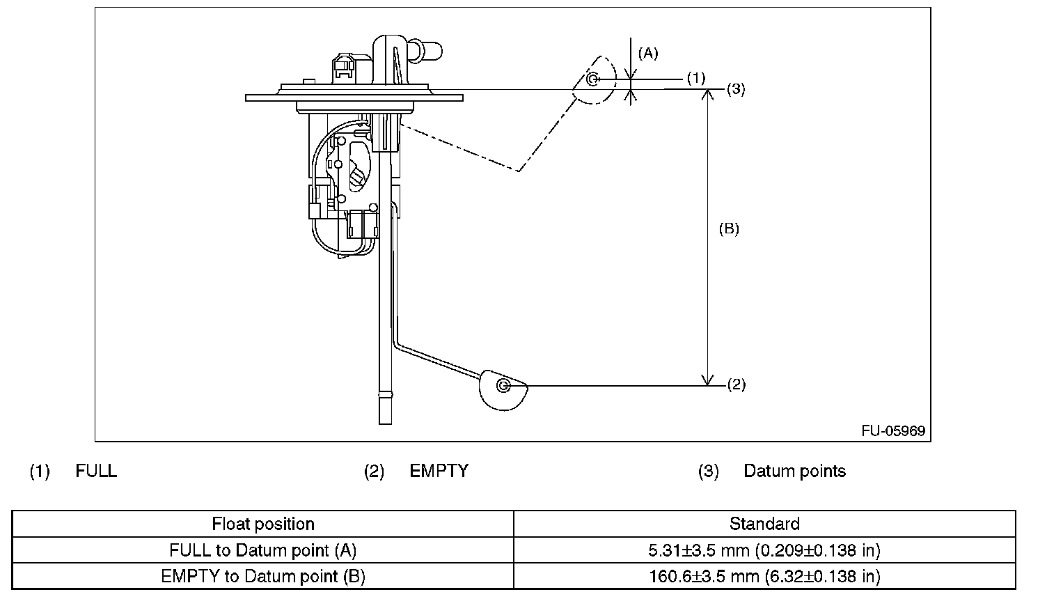 Measure the fuel sub level sensor float position.
