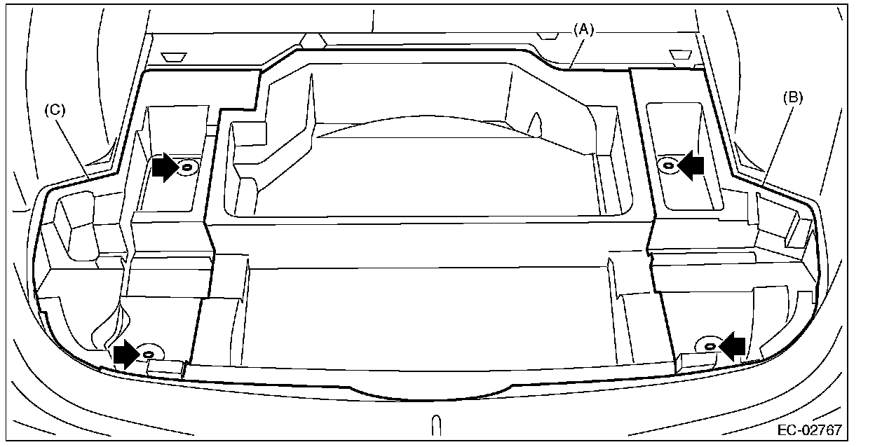 3. Remove the center sub trunk (A) (model with center sub trunk), and remove the sub trunk RH (B) and sub trunk LH (C) fixed by clips.