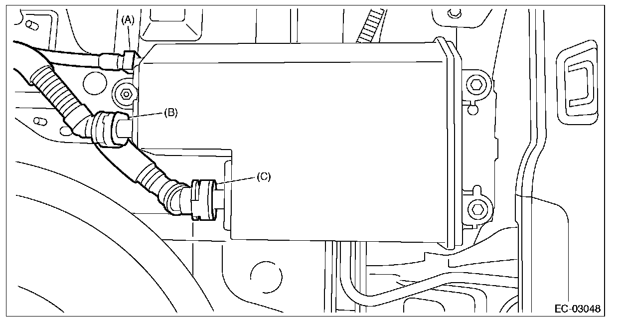 8. Disconnect the purge tube (A), vent tube (B), and drain tube A (C).