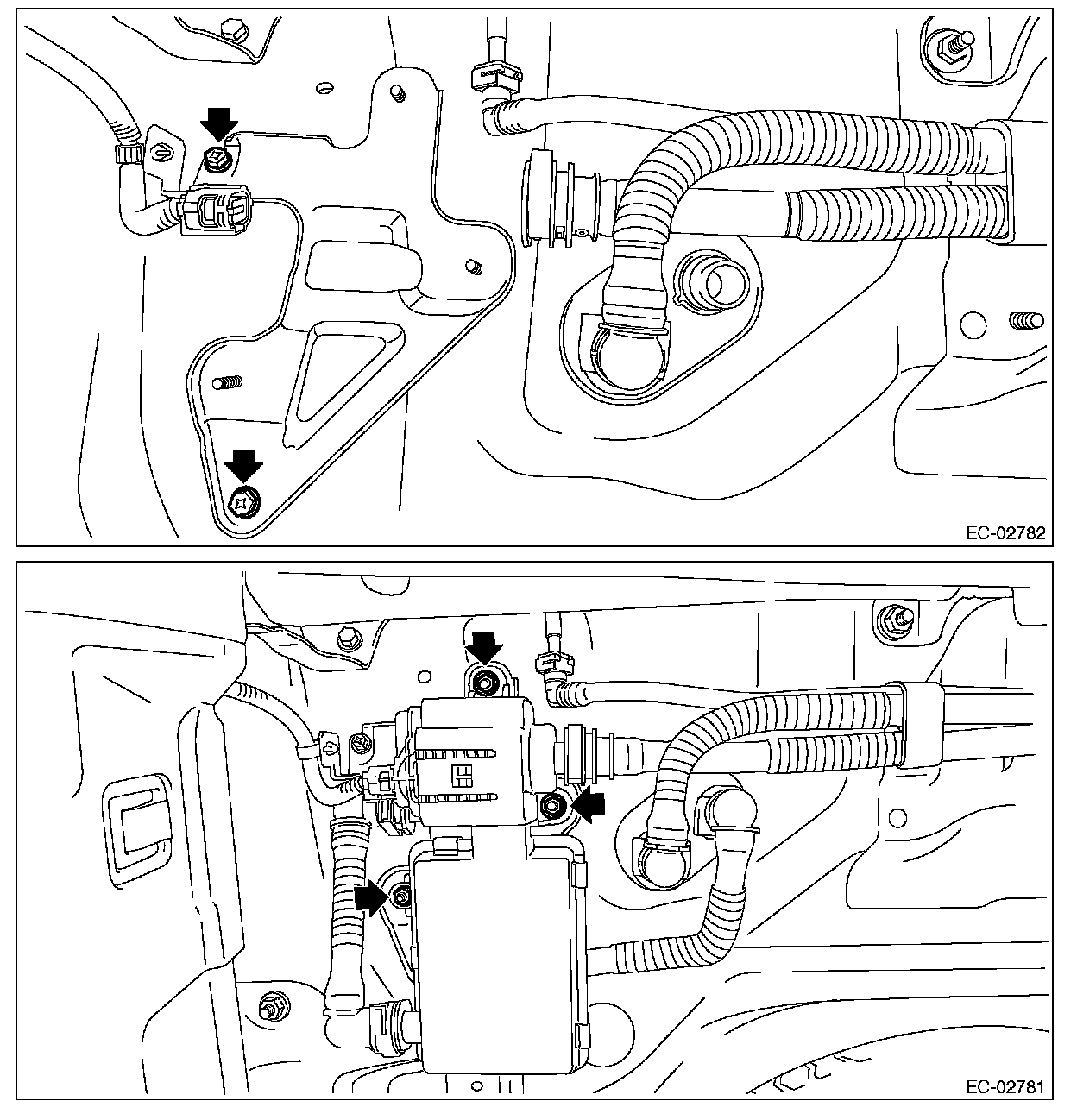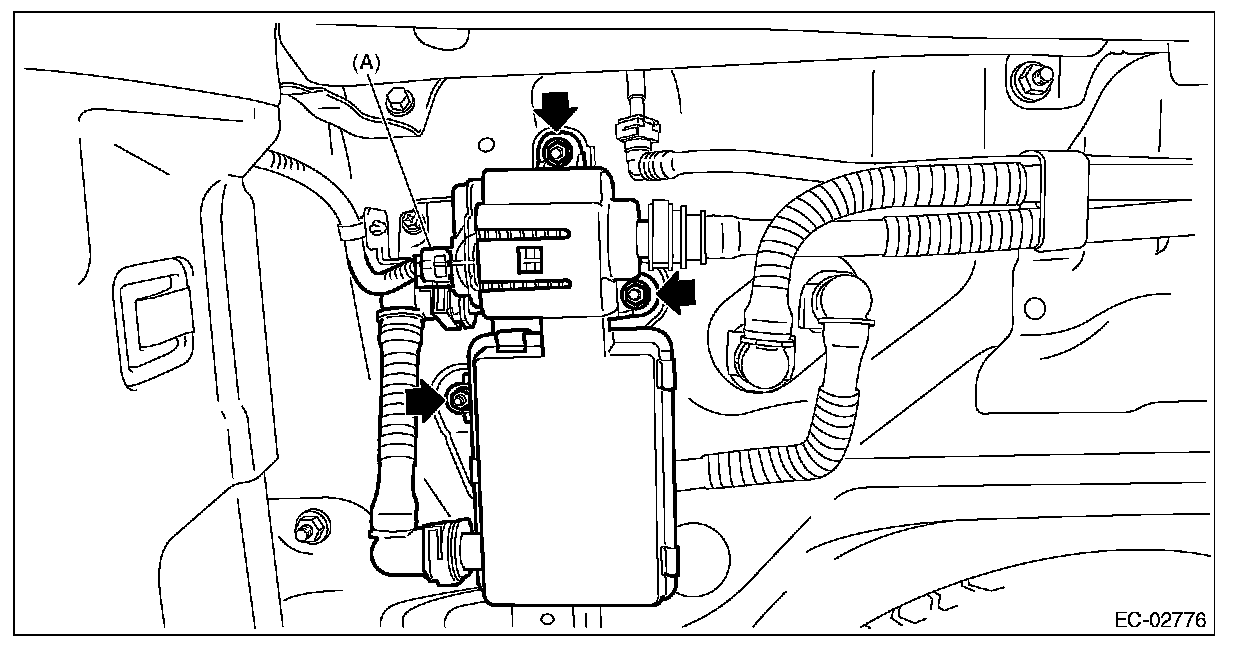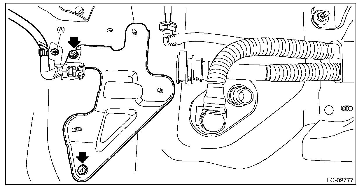 13. Remove the clip (A) which secures the leak check valve harness to the bracket, and remove the valve bracket.
