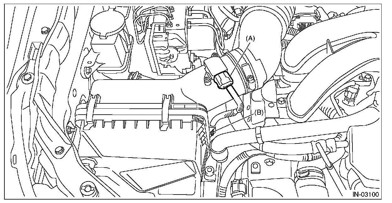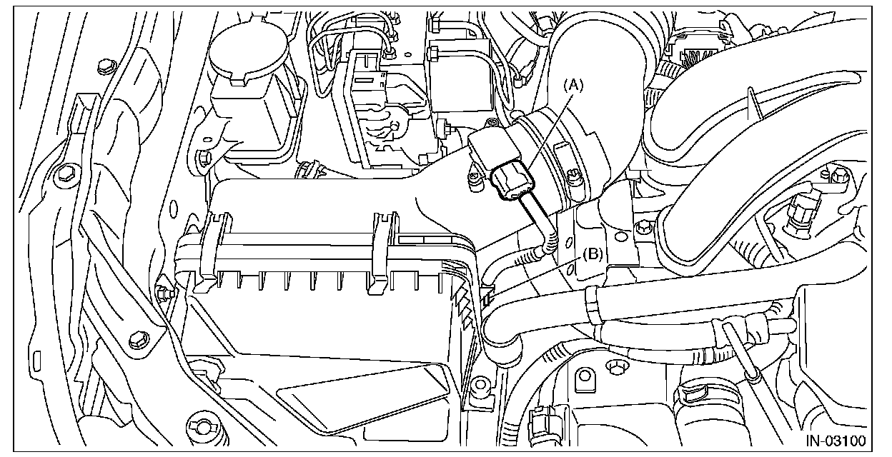 4. Disconnect the connector (A) from the mass air flow and intake air temperature sensor, and remove the clip (B).