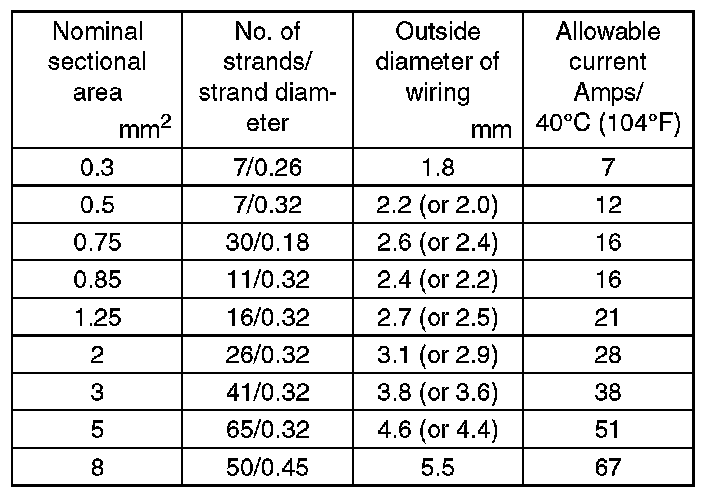 - The table lists the nominal sectional areas and allowable currents of the wires.