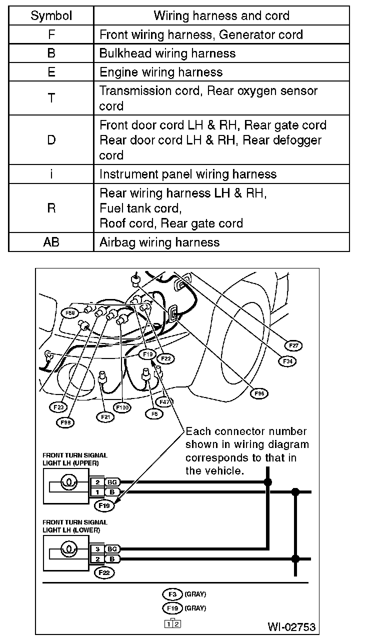 - Each connector number shown in the wiring diagram corresponds to that in the wiring harness. The location of each connector in the actual vehicle is determined by reading the first character of the connector (for example, a "F" for F8, "i" for i16, etc.) and the type of wiring harness. The first character of each connector number corresponds to the area or system of the vehicle.