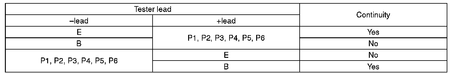 1. Check for continuity between the diode lead and terminal E or B. If continuity is not as shown in the table, replace the rectifier.
