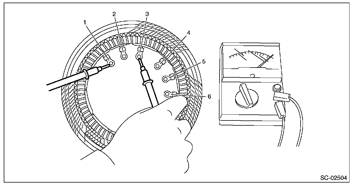 Using a circuit tester, check the resistance between slip rings. If the resistance is not within the standard, replace the rotor.