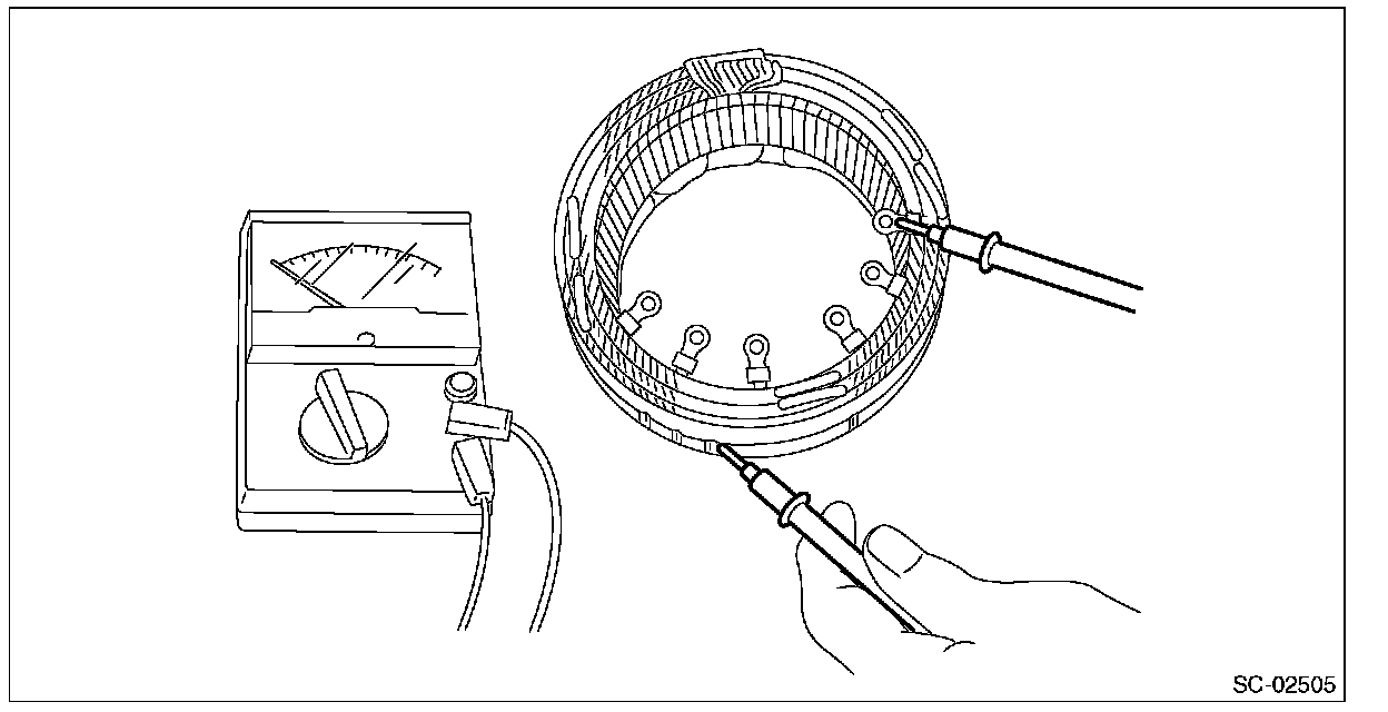 Inspect the continuity between the stator coil stator core and lead wire terminals. If there is continuity, replace the stator coil because the stator coil is grounded.