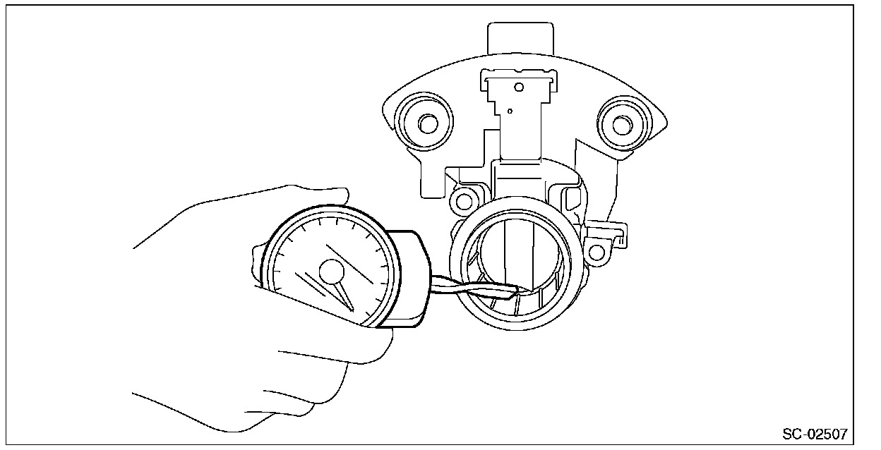 2. Check that there is appropriate pressure on the brush spring. Using a spring pressure indicator, push the brush into the brush holder until its tip protrudes 2 mm (0.0787 in). Then measure the pressure of brush spring. If the pressure is 1.7 N (173 gf, 6.11 ozf) or less, replace the brush spring. 4.1 - 5.3 N (418 - 540 gf, 14.75 - 19.06 ozf) pressure is required on the new spring.
