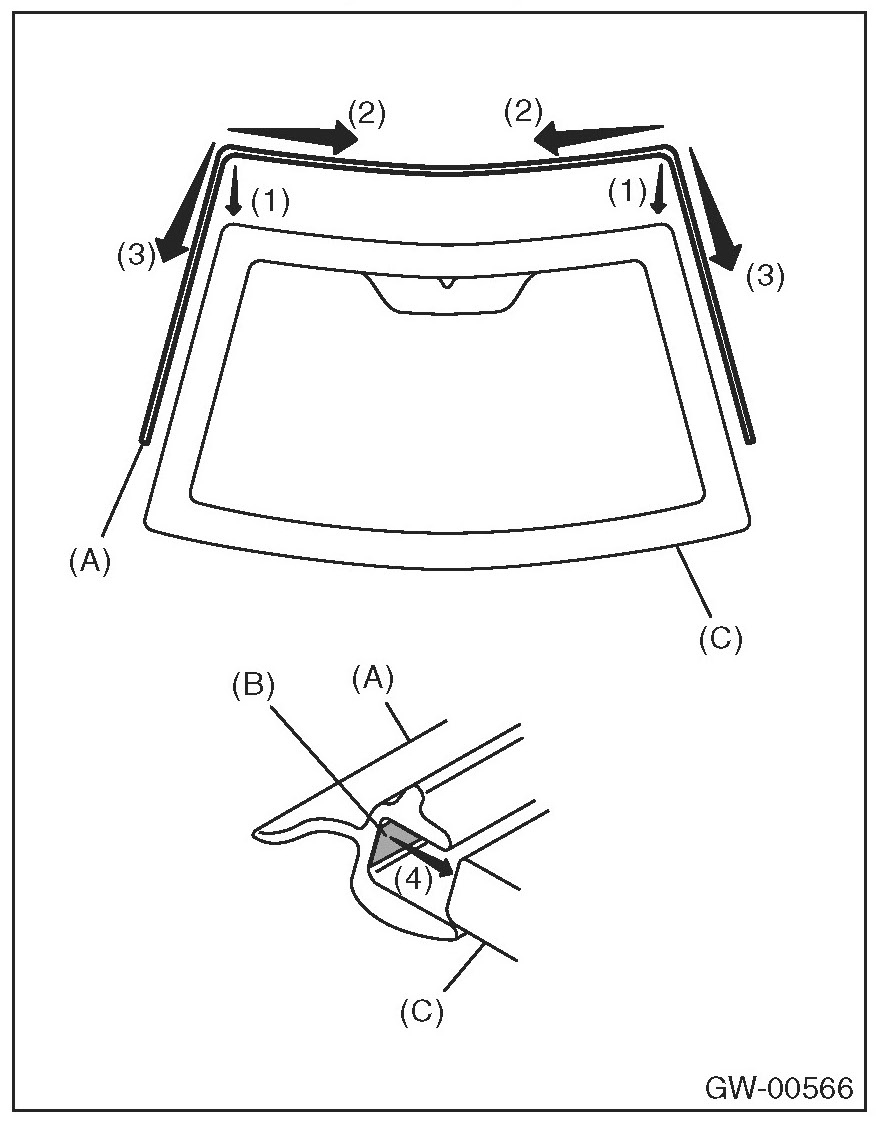 1. Align the molding (A) to the upper ends of the windshield glass (C).