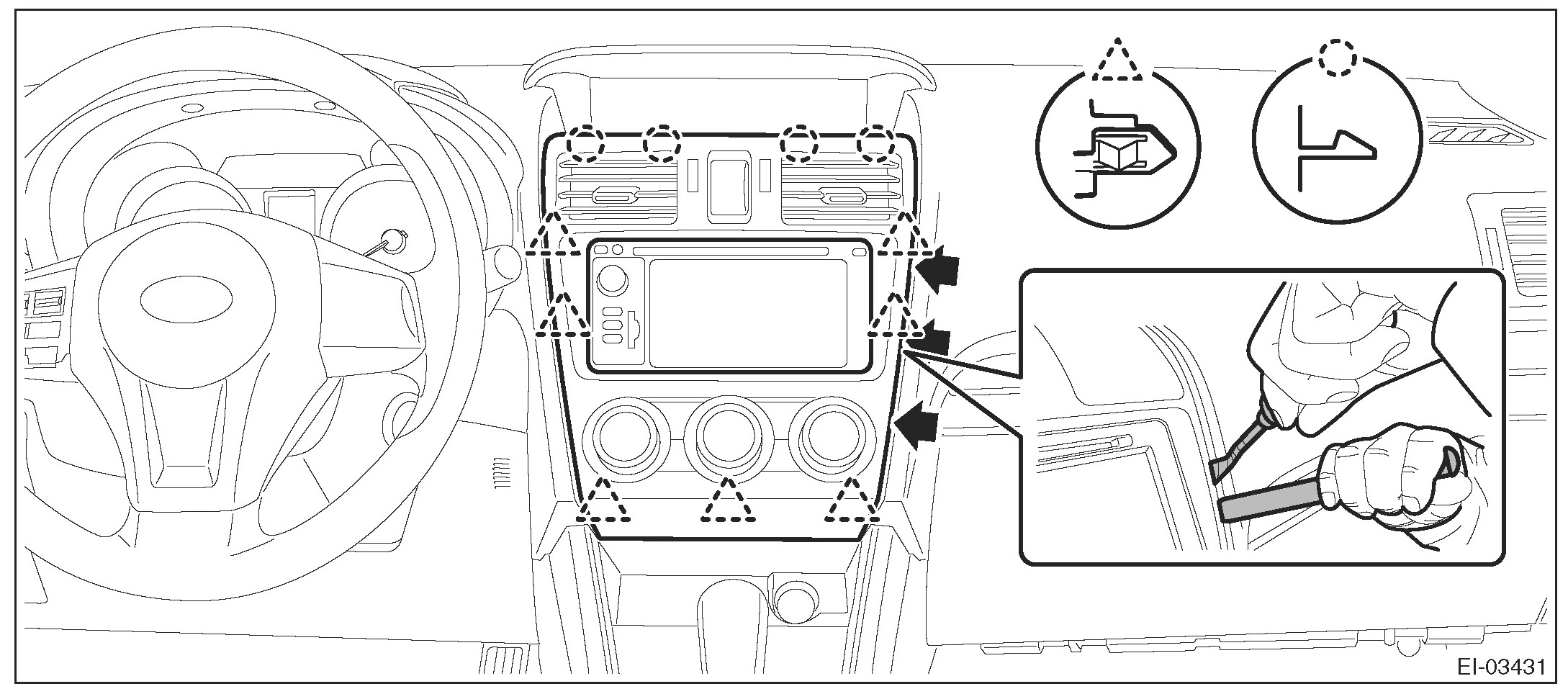 1. Insert a plastic remover to the three areas shown by the arrows, and lift up the panel center assembly slightly.