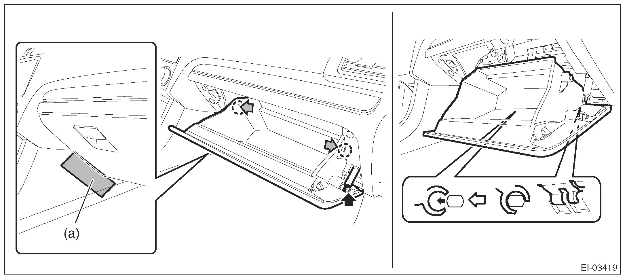 3. Release the glove box dampers and stoppers, and remove the pocket assembly by pulling it toward you.