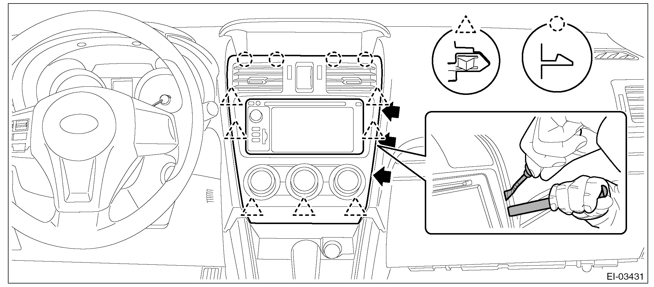 1. Insert a plastic remover to the three areas shown by the arrows, and lift up the panel center assembly slightly.