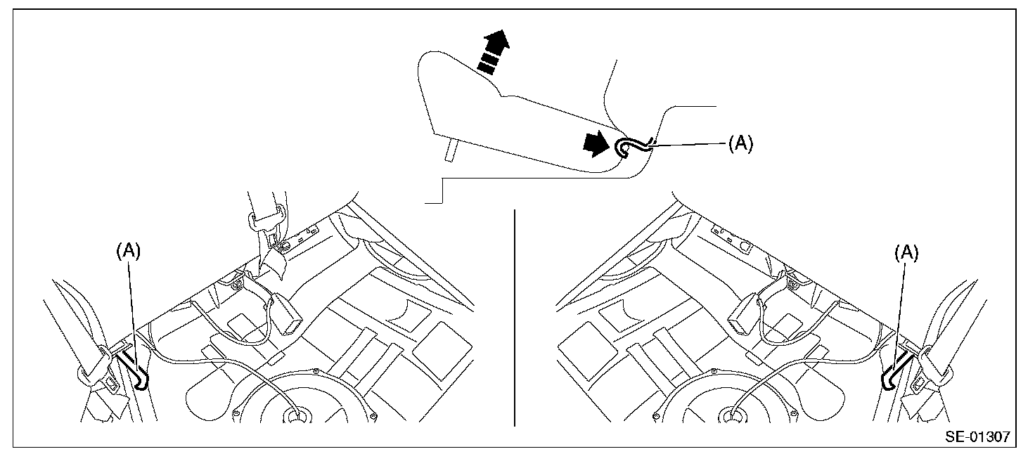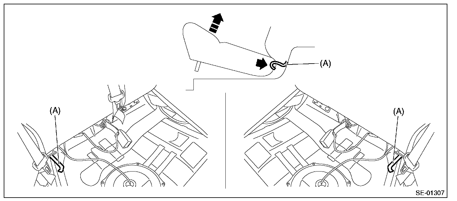 4. Remove the hook (A) by pushing it back while lifting the front side of the rear seat cushion, and remove the rear seat cushion.