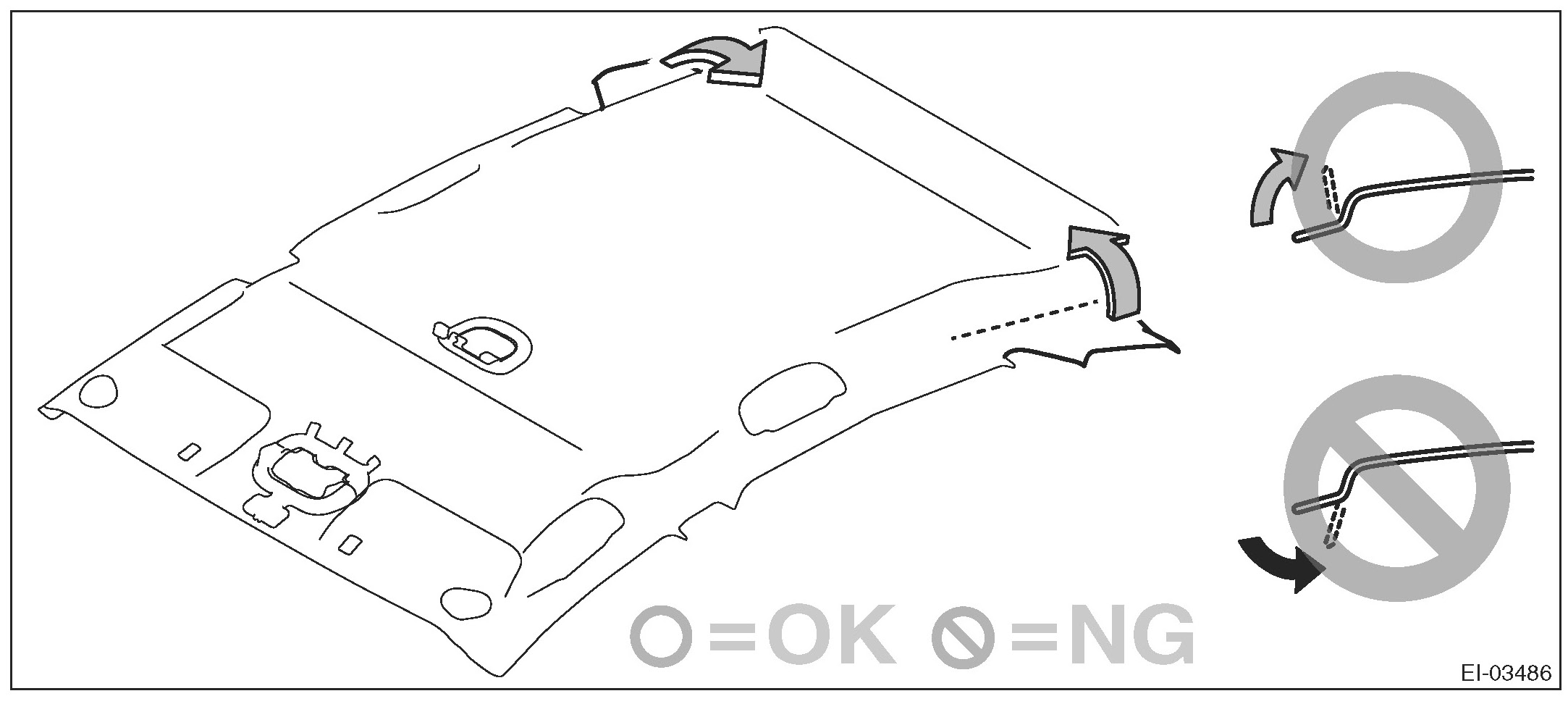 CAUTION: Be careful of the bending direction. If the direction is wrong, the trim panel - roof assembly may be wrinkled.
