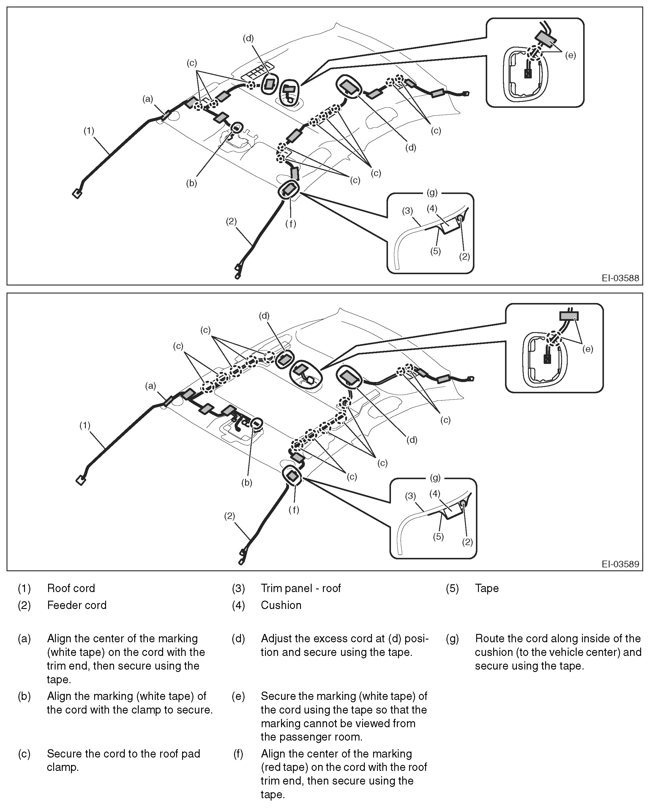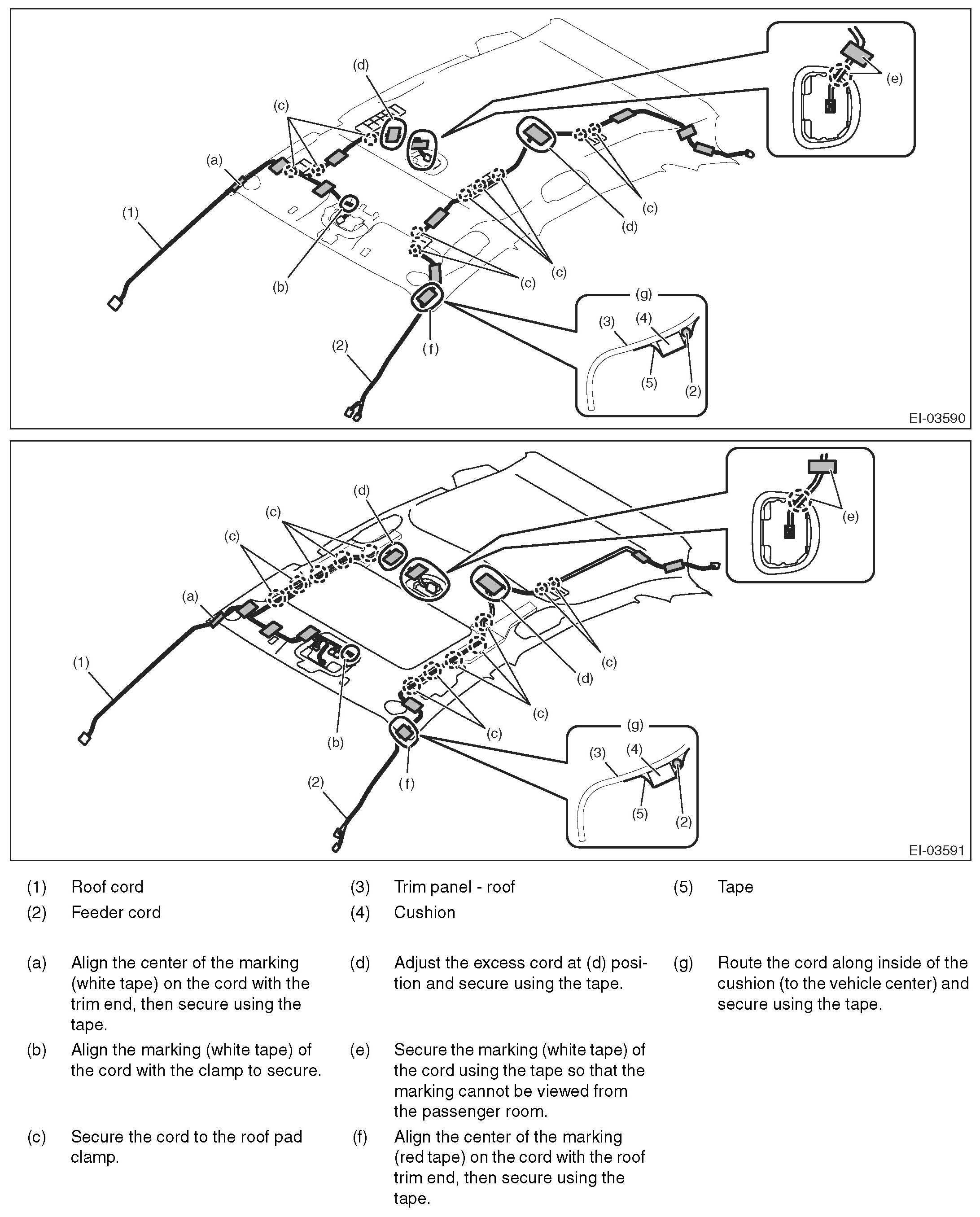 CAUTION: Route each cord carefully. The cord may interfere, thus preventing normal operation of the curtain airbag when necessary.