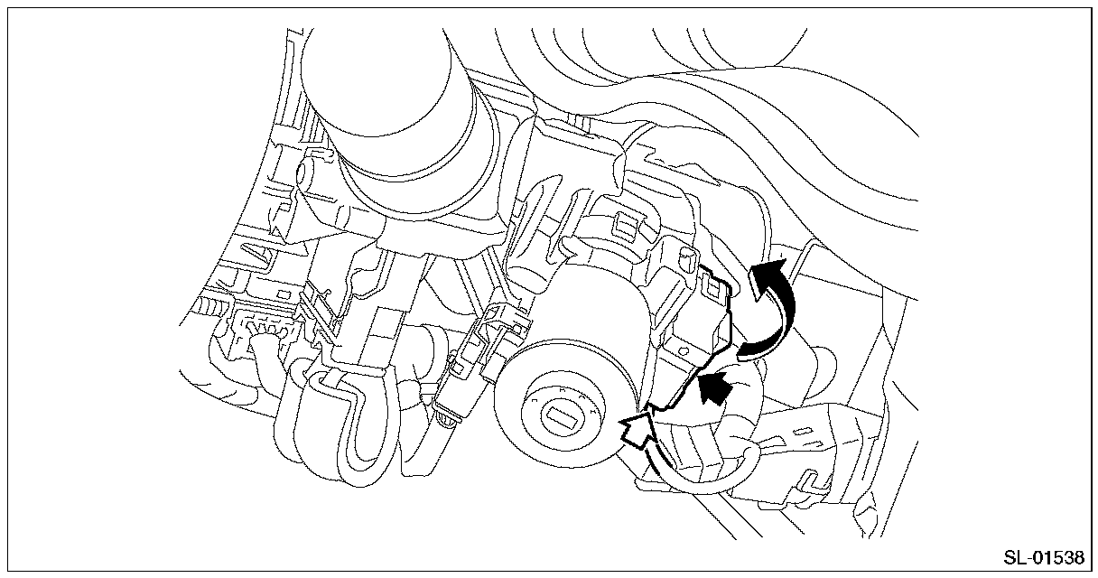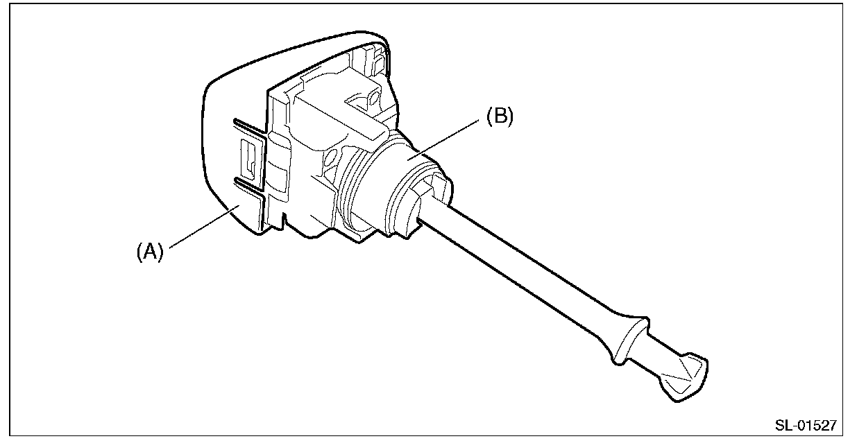 2. Insert a flat tip screwdriver from the steering lock frame hole (A), and pull the key cylinder until the key cylinder claws touch the steering lock frame stopper (B).