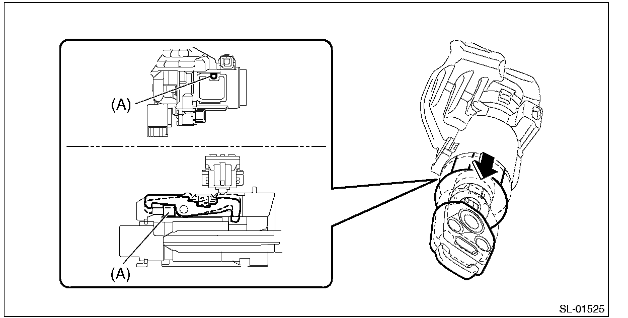 3. Insert a flat tip screwdriver from the steering lock frame hole (A), and release the claws to pull out the key cylinder.