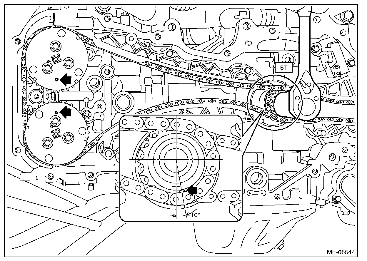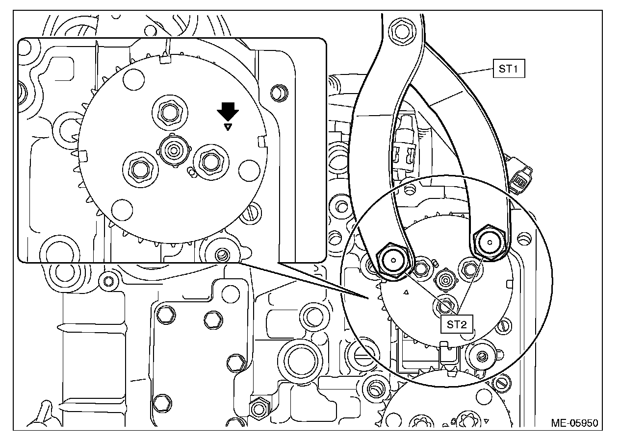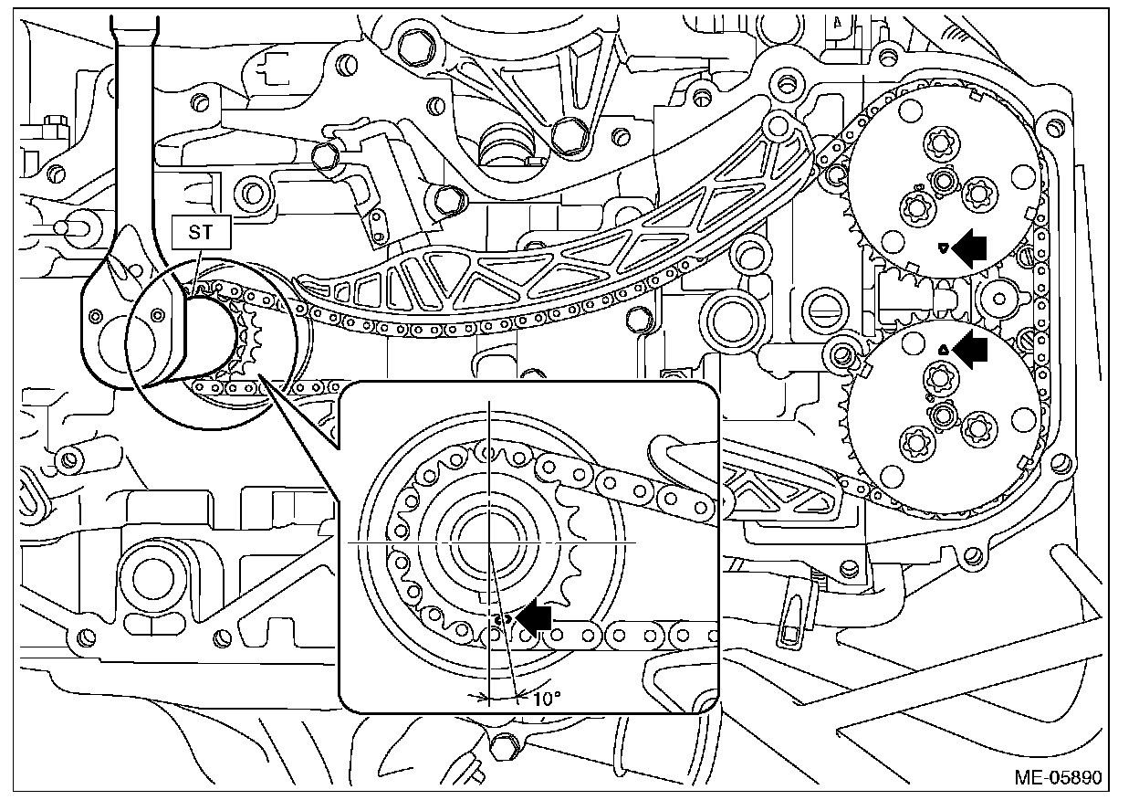 8) Using ST and by turning the intake cam sprocket LH approximately 180°, align the alignment marks of intake cam sprocket LH to the positions (zero-lift position) as shown in the figure.