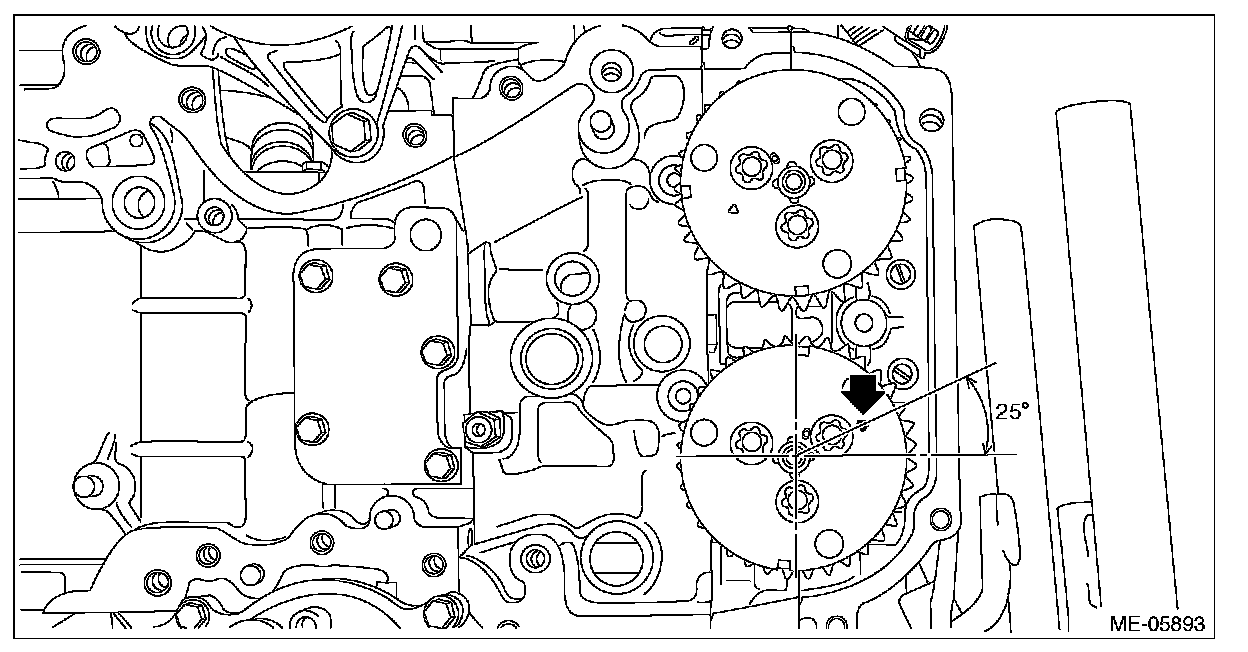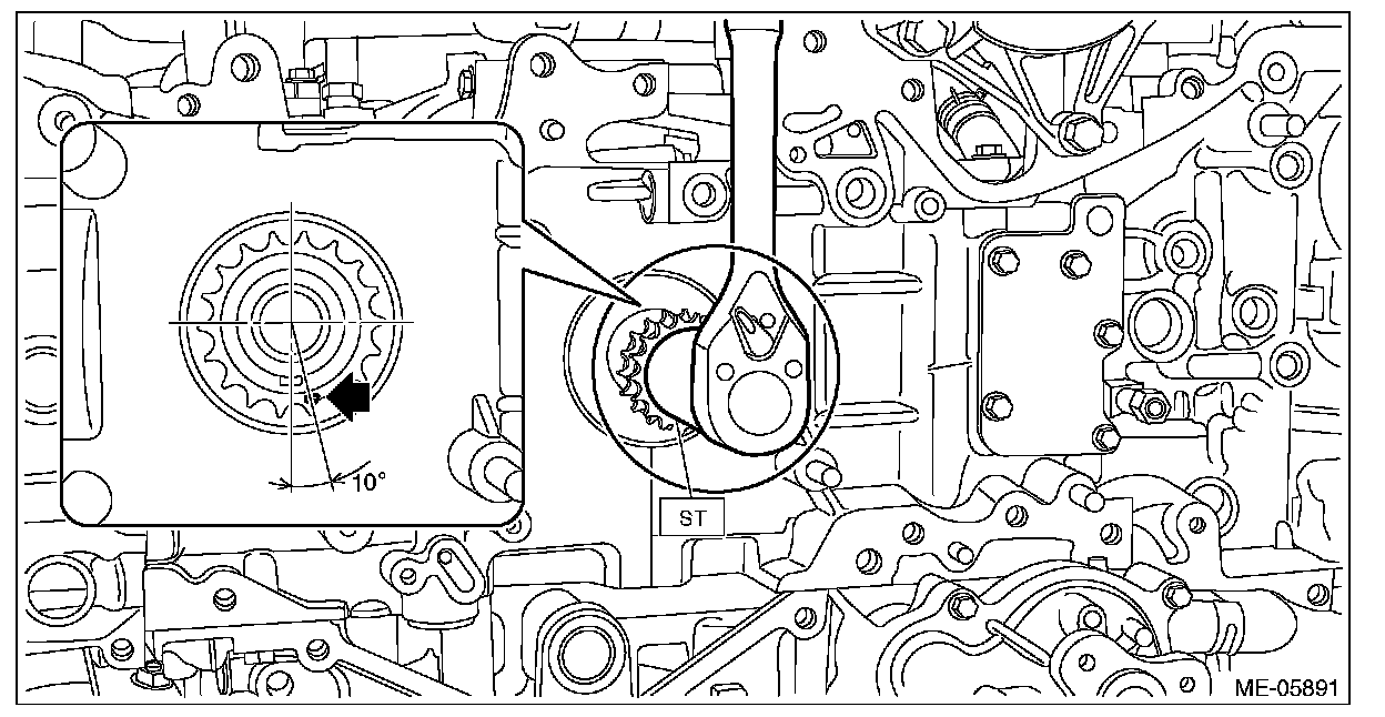 2) Check that the crank sprocket is located at the position sown in the figure. If not aligned, using ST turn the crankshaft to align the crank sprocket alignment mark to the position shown in the figure.