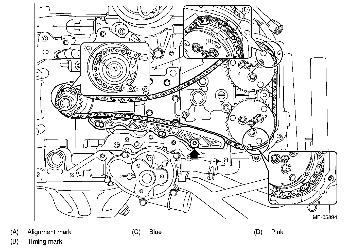 - Matching of the timing chain mark (pink) to the timing mark position of the intake cam sprocket LH.