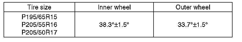 3) With the steering wheel held at each fully turned position, measure both the inner and outer wheel steering angles.