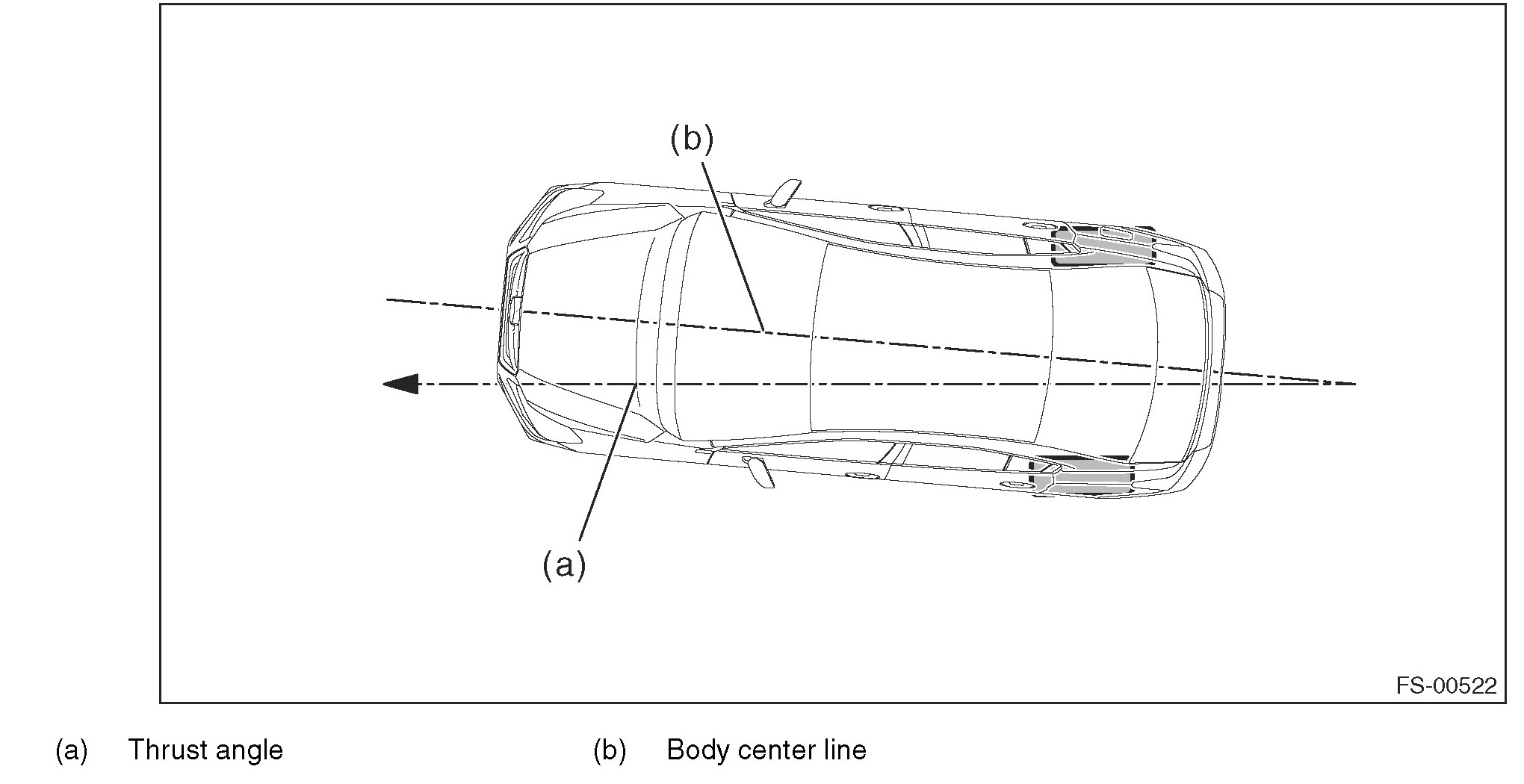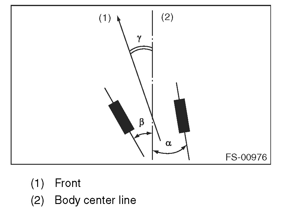 Thrust angle is a mean value of left and right wheel toe angles in relation to the vehicle body center line. Vehicle is driven straight in the thrust angle direction while slanting in the oblique direction depending on the degree of the mean thrust angle.