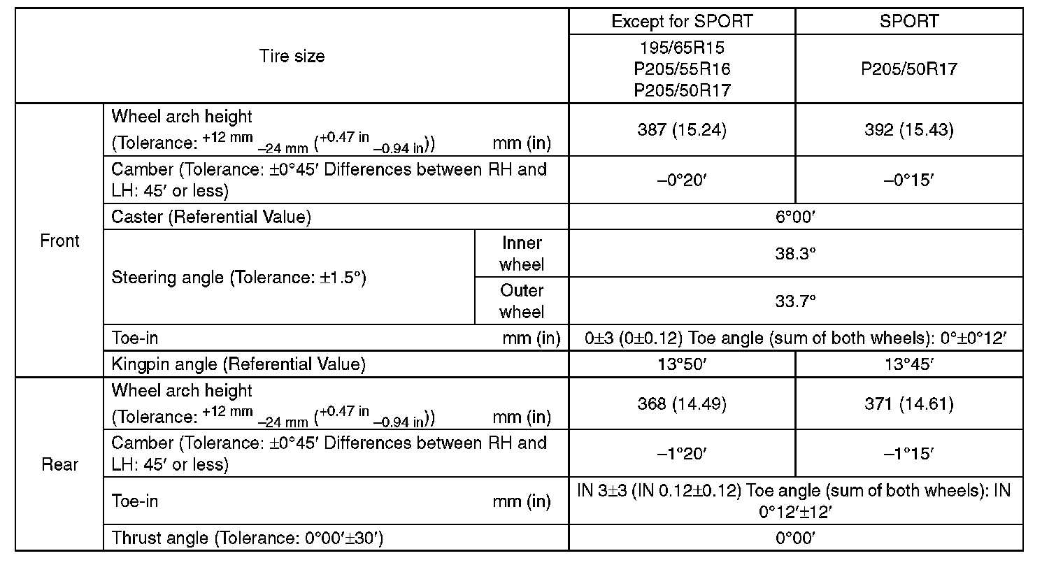 ^ Other items except for front toe-in, rear toe-in and front camber that are described in the specification chart cannot be adjusted. If other items exceed the tolerance range of the specification chart, check the suspension parts and connections for deformation. If defective, replace with new parts.