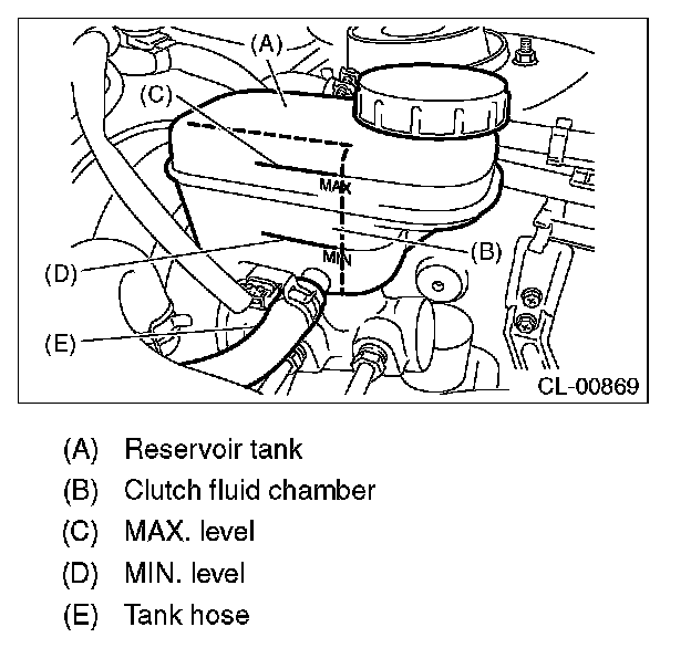 2) Inspect the fluid level using the scale on the outside of the reservoir tank. If the level is below "MIN", add fluid to bring it up to "MAX", and also inspect for leakage.