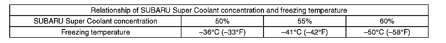Use the SUBARU Super Coolant with a 50 - 60% concentration in order to obtain maximum antifreeze and anti-rust performance.