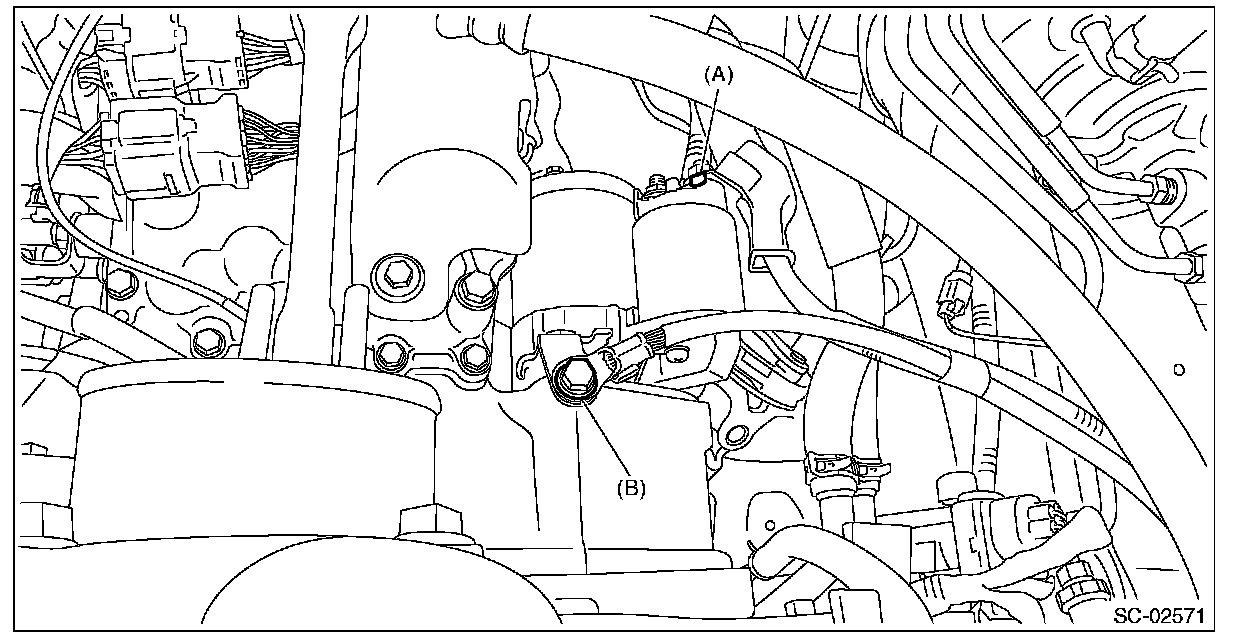 12. Remove the starter ground cable (B) and remove the battery cable.