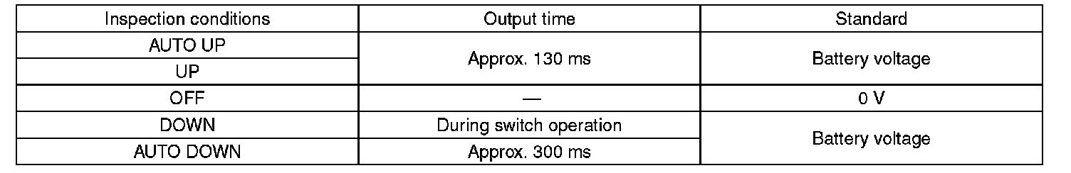 NOTE: Since output time during window UP operation is extremely short, it cannot be checked without using a measuring instrument such as oscilloscope. Output is constantly produced while the switch is operated for window DOWN operation.