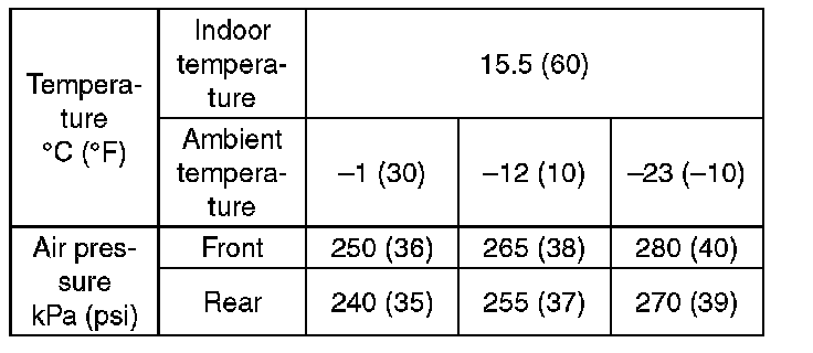 ^ When adjusting tire pressure indoors in winter, there is a big temperature difference between the indoor facilities and outside. Once the car is outside where the temperature is lower, the air pressure in the tires will drop, causing the tire pressure warning light to illuminate, even if the pressure in the tires was adjusted to standard values indoors. To avoid this, it is necessary to adjust the tire pressure to the high side in consideration of the difference in temperature between inside and outside according to the following table. 235/45R17, 245/40R18