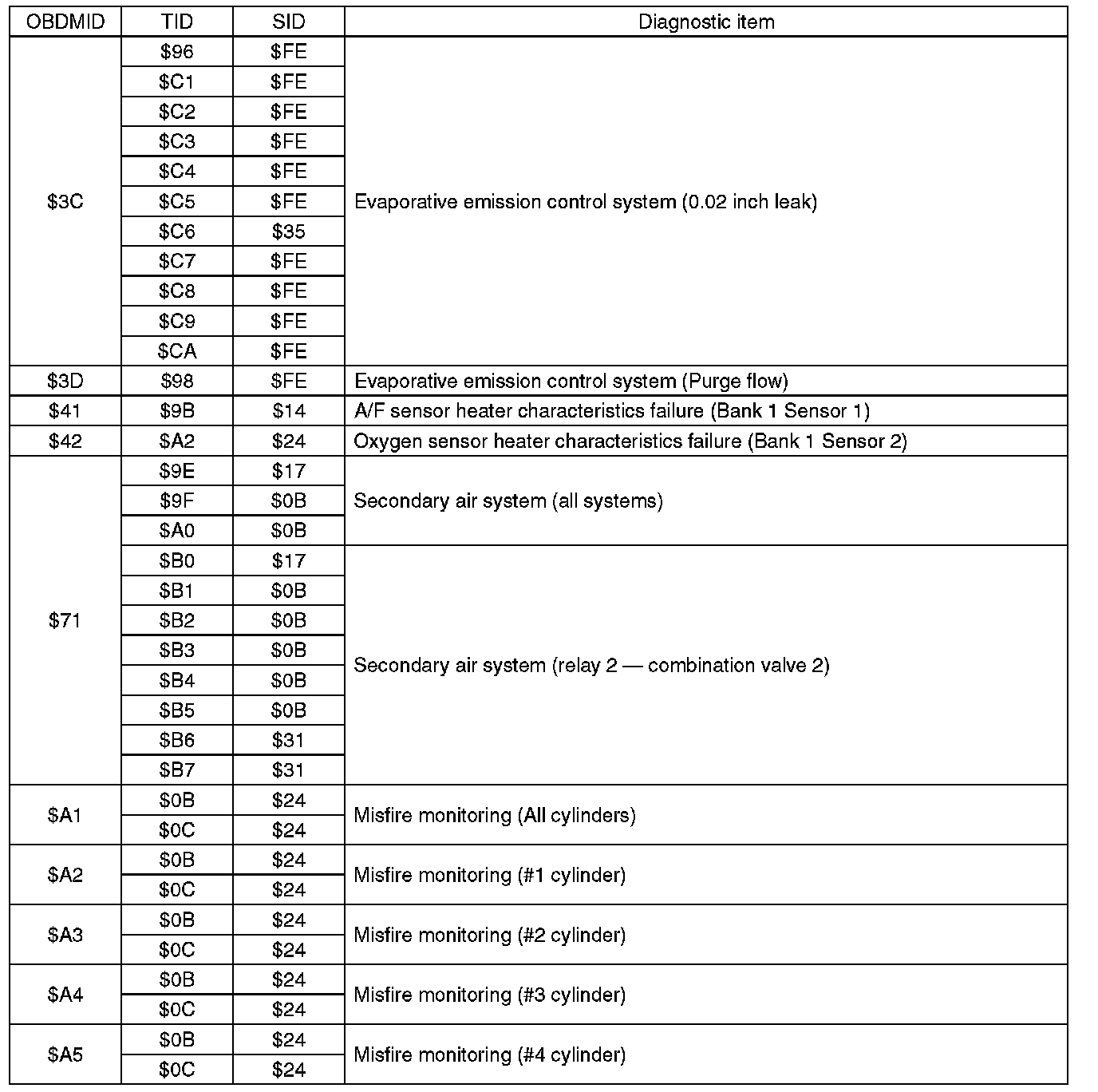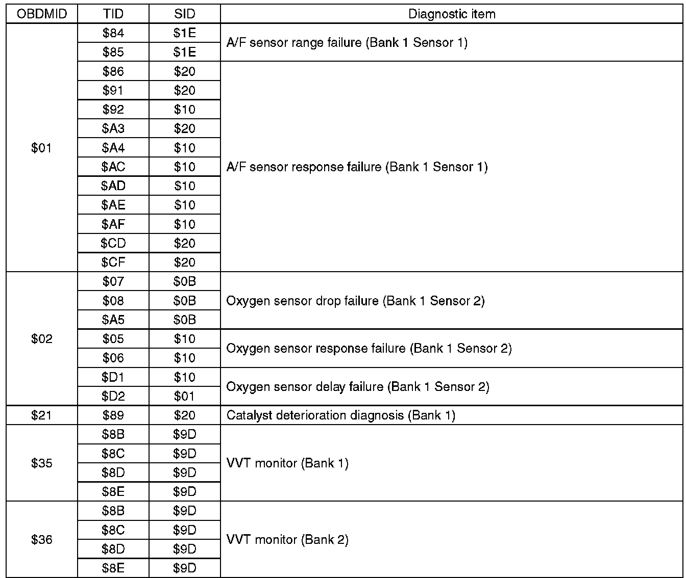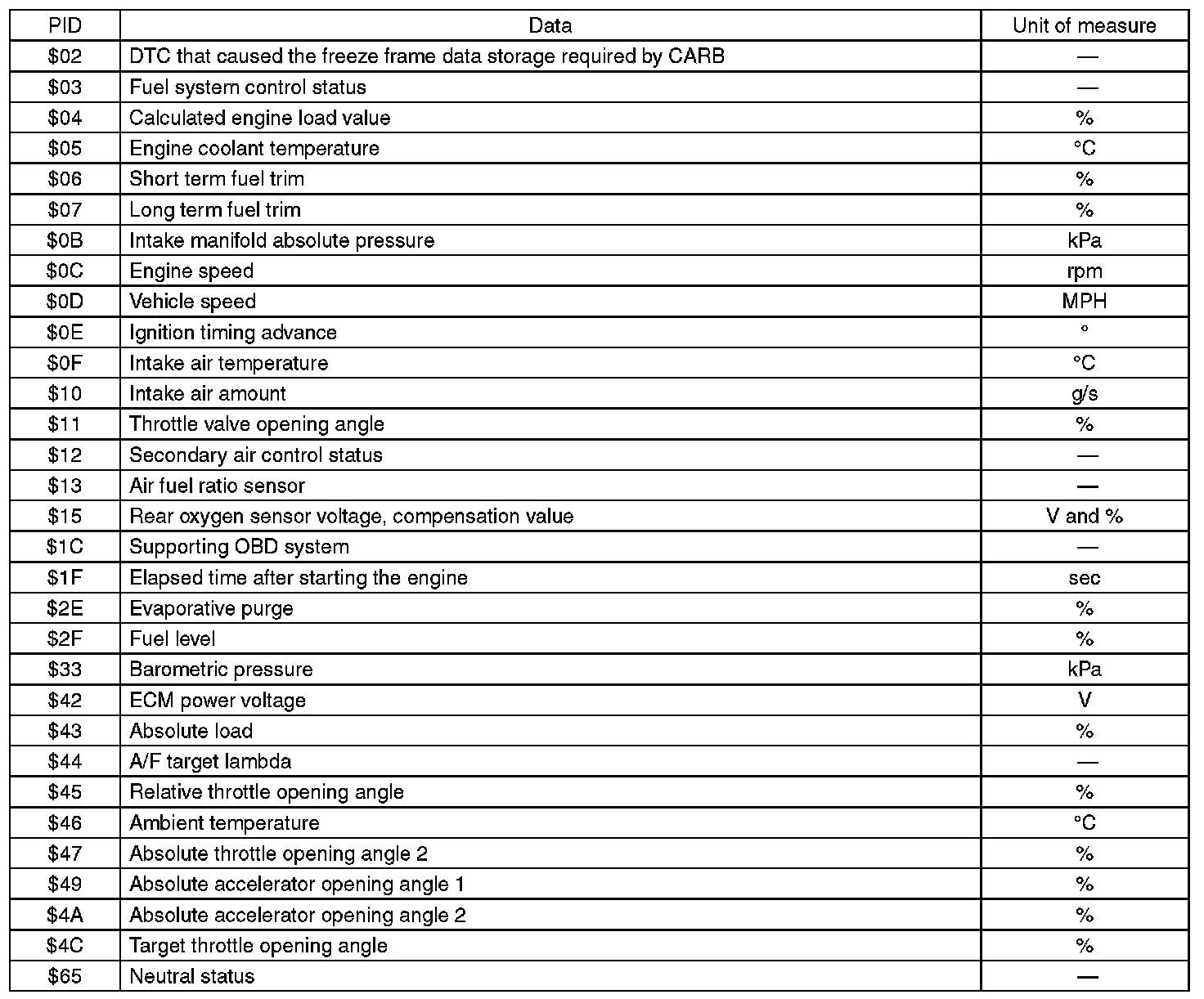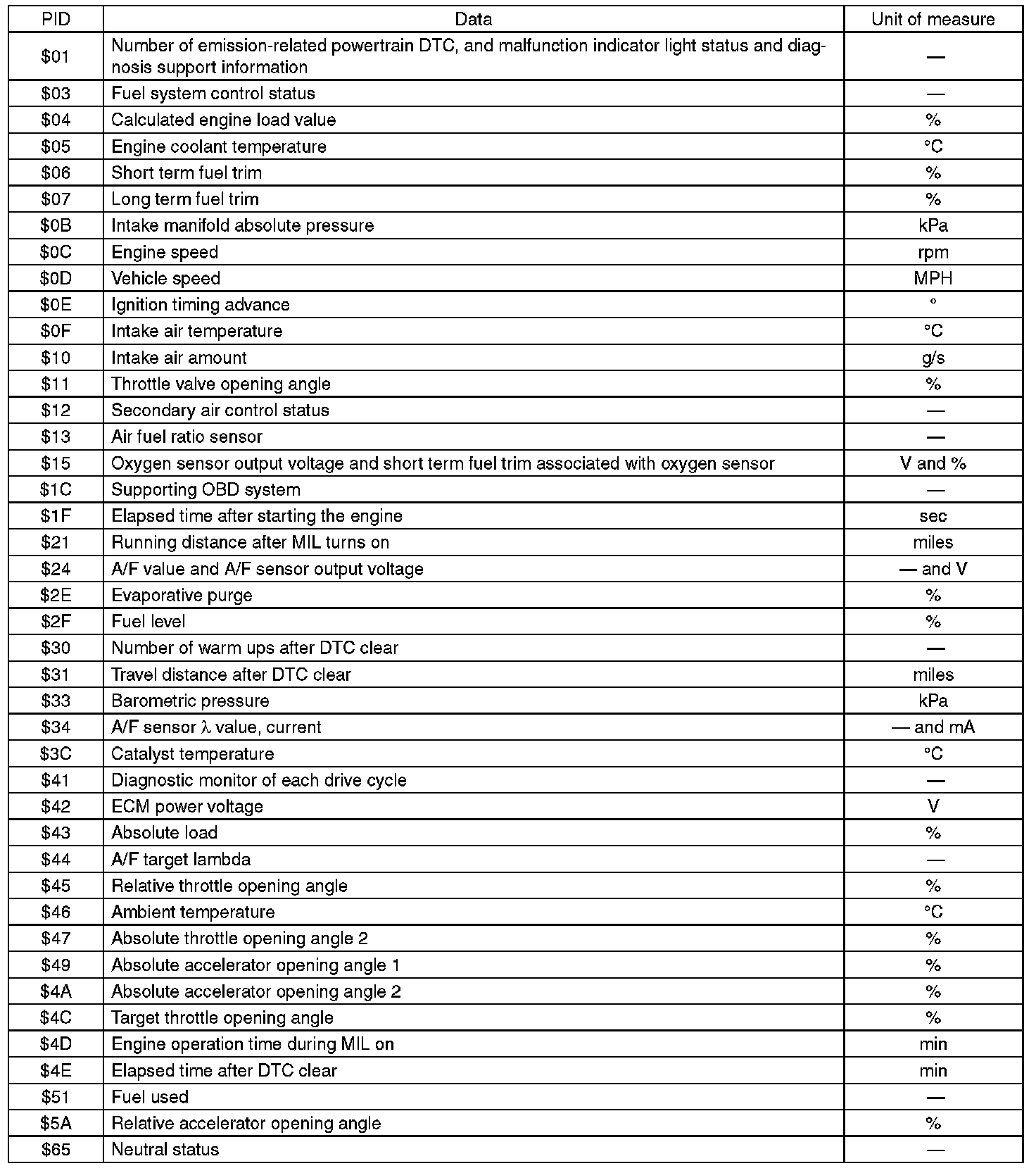 A list of the support data and PID (Parameter Identification) codes are shown in the following table.