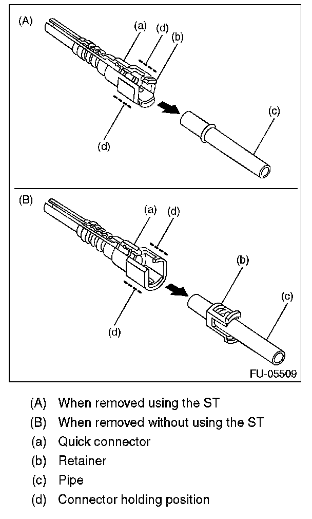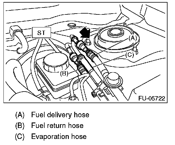 2. Disconnect the quick connector of the fuel delivery hose and fuel return hose by pushing the ST in the direction of the arrow.