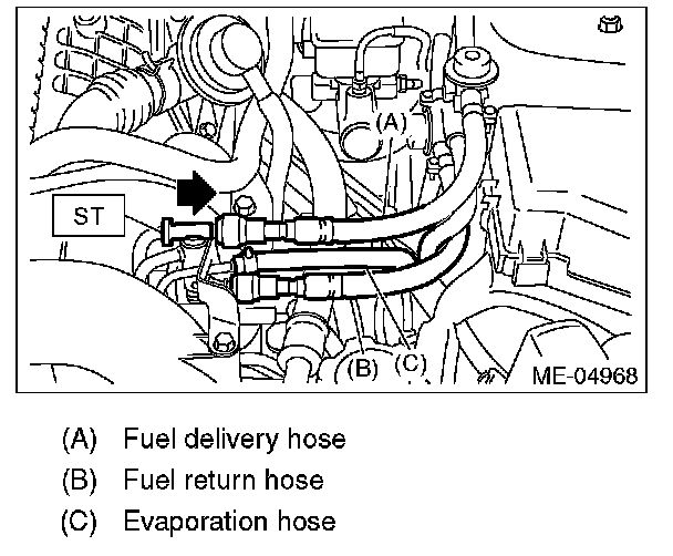 2. Attach ST to the fuel delivery pipe and push ST in the direction of arrow mark to disconnect the fuel delivery hose.