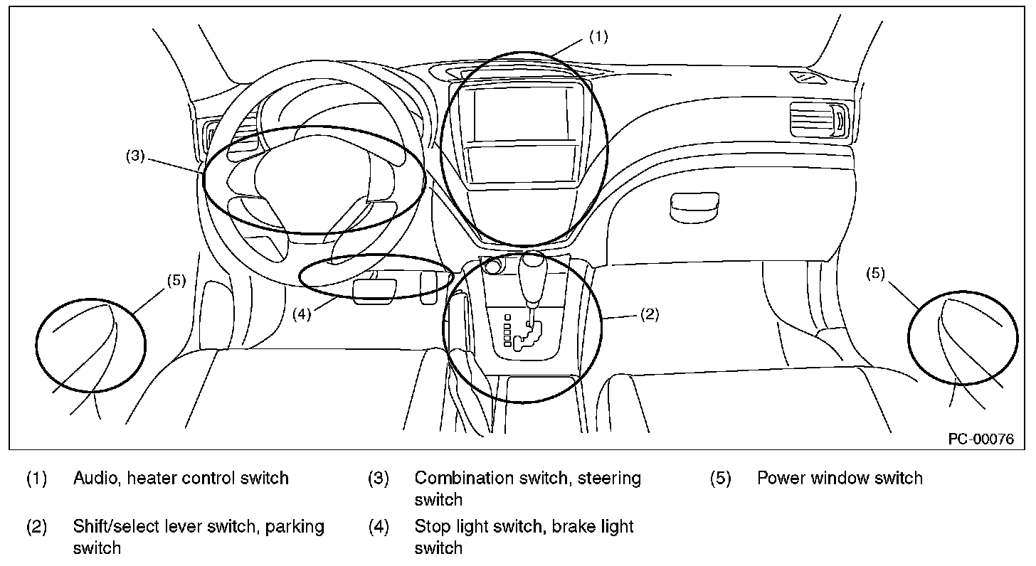 To prevent bodily injury from unexpected deployment of airbags and unnecessary maintenance, follow the instructions in this manual when performing maintenance on the airbag components or nearby, around front of the vehicle (radiator panel, front wheel apron, front side frame, bumper, hood, front fender), around side of the vehicle (front door, rear door, center pillar, rear fender, side sill, rear wheel apron), around rear of the vehicle (rear seat cushion, rear floor, rear crossmember) and the airbag wiring harnesses or nearby.