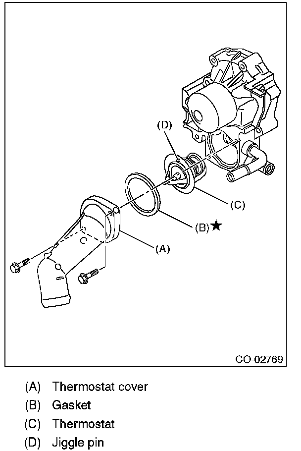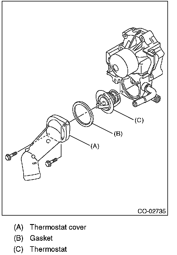 5) Remove the thermostat cover, and then remove the gasket and thermostat.